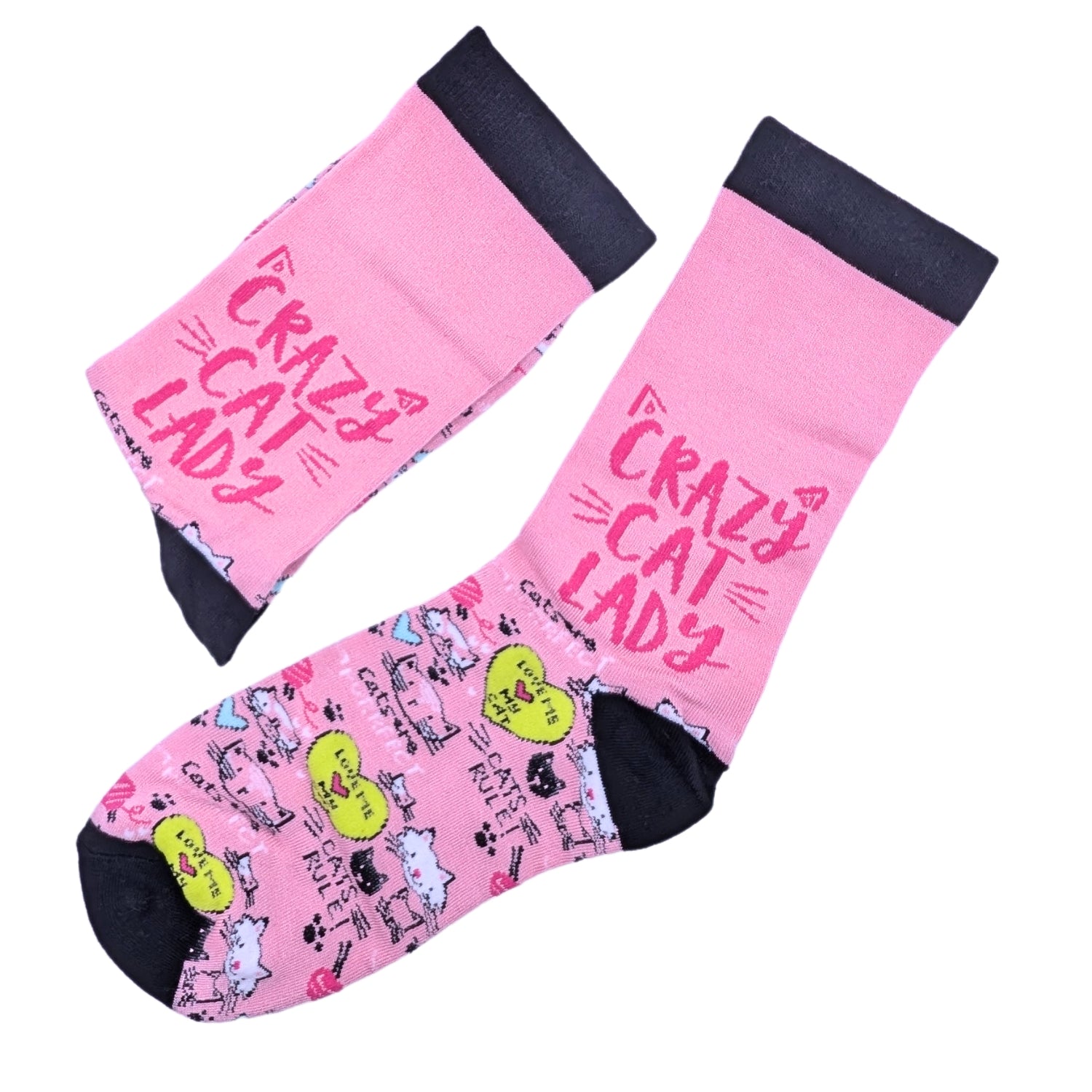 Details: These socks from WPL Gifts feature pink cat faces, paws, whiskers, and hearts with the caption 'Crazy Cat Lady.' Part of the Sox Appeal range, they make a playful gift for someone special.