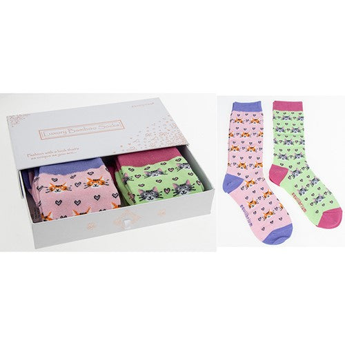 Details: A set of two pairs of a gorgeous bamboo socks in an all over design presented beautifully in a drawer style gift box. These luxury bamboo socks are made from 65% bamboo fibres making them eco friendly whilst being super soft and comfy too. A great gift idea for her.