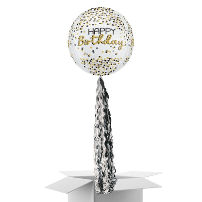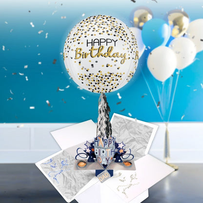 Contents: A large 16” helium-inflated bubble balloon with a ribbon and tissue paper tassel tail floats from a box filled with vibrant tissue and confetti. The balloon is anchored with a personalised pop-up card, creating the ultimate celebration surprise.