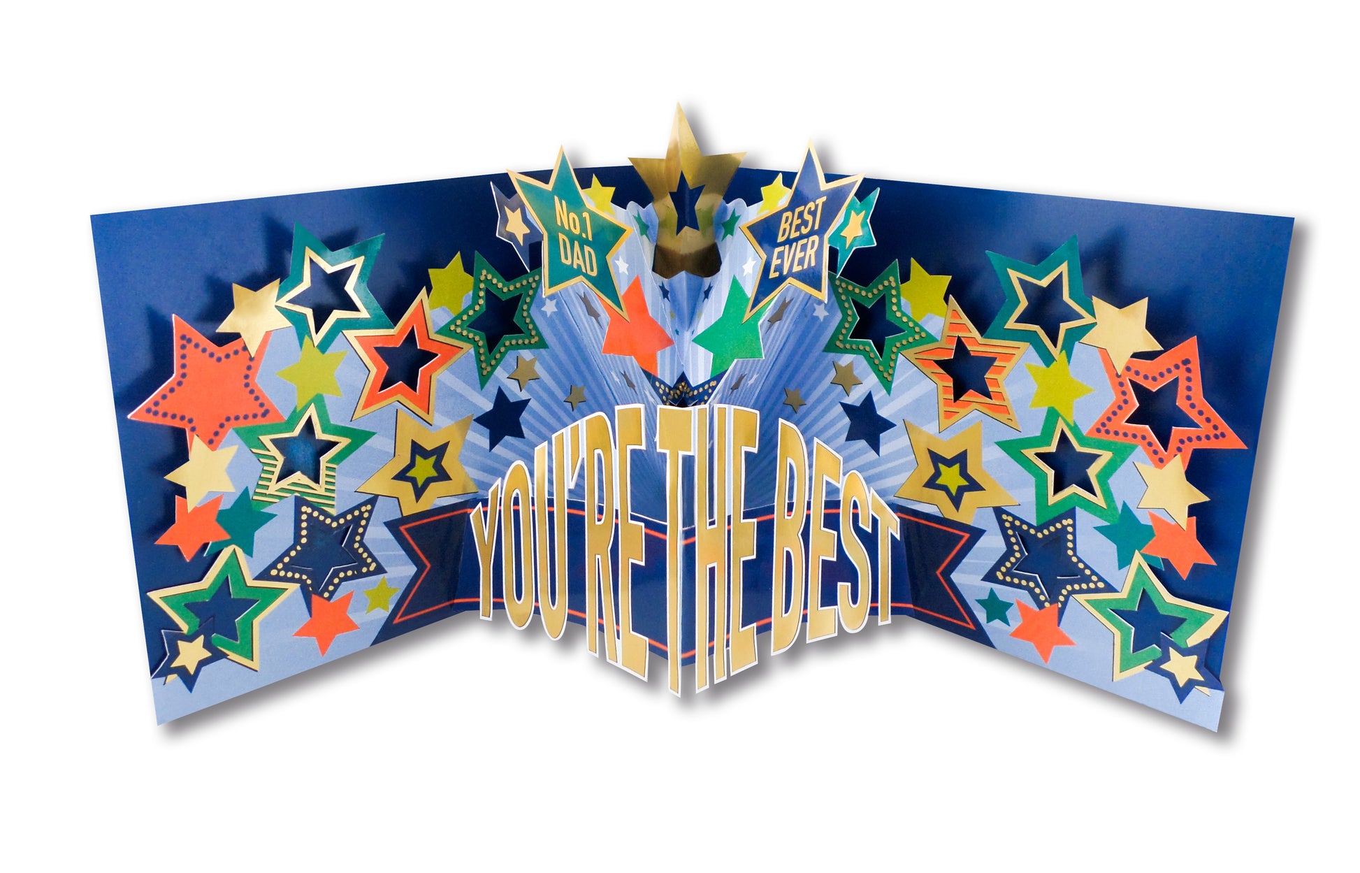 Looking for greeting card ideas for him? Imagine the joy on Dad's face when he opens this magical fold-out greeting card! The pop out display of bright stars will surprise and delight him, making him feel truly special.