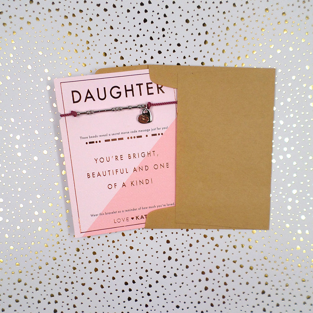 Details: Beautiful keepsake friendship bracelet with a hidden morse code message! Use the key provided to reveal the sentiment* Each bracelet is made of a quality cord with rhodium-plated beads for durability and brilliance. The heart charm is engraved with the message "Daughter, you're so loved " Perfect for any gifting occasion, including birthdays, Christmas, as a stocking-filler or "just because". Mounted on a quality backing card, with an inspirational quote hot stamped in shiny rose gold foil. Accompanied with a cute craft envelope to post or simply give as a thoughtful gift. Each bracelet is size adjustable. *Once revealed, the morse code message reads "LOVED".