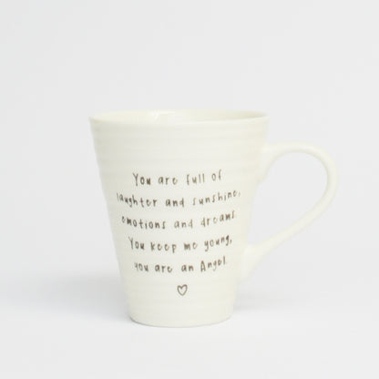 Details: A gorgeous sentimental mug with a caption on the front and rear: 'Daughter' 'You are full of laughter and sunshine, emotions and dreams. You keep me young, you are an Angel.'