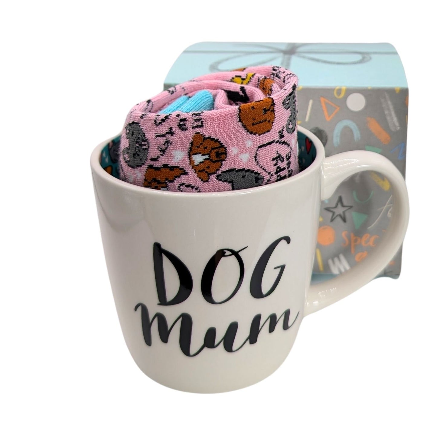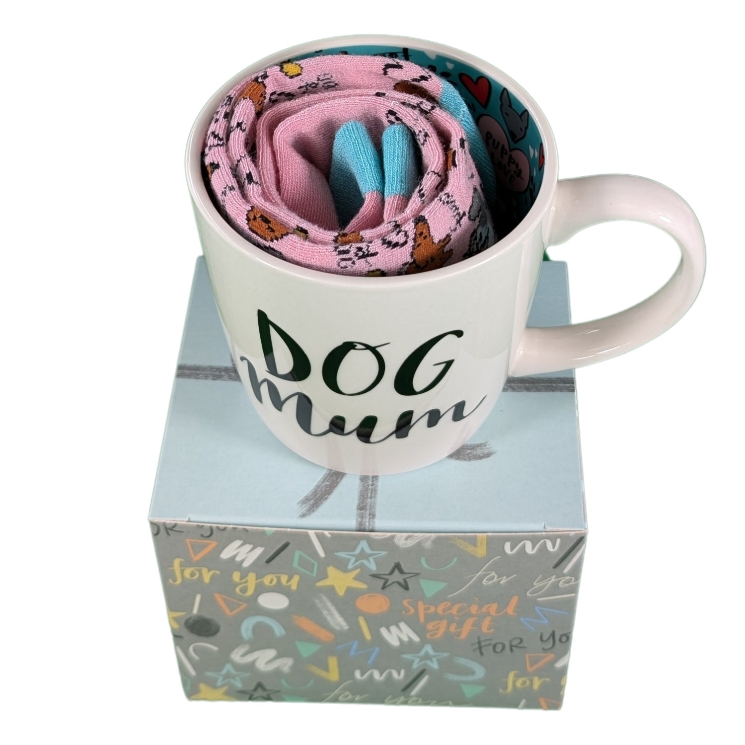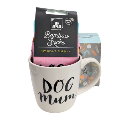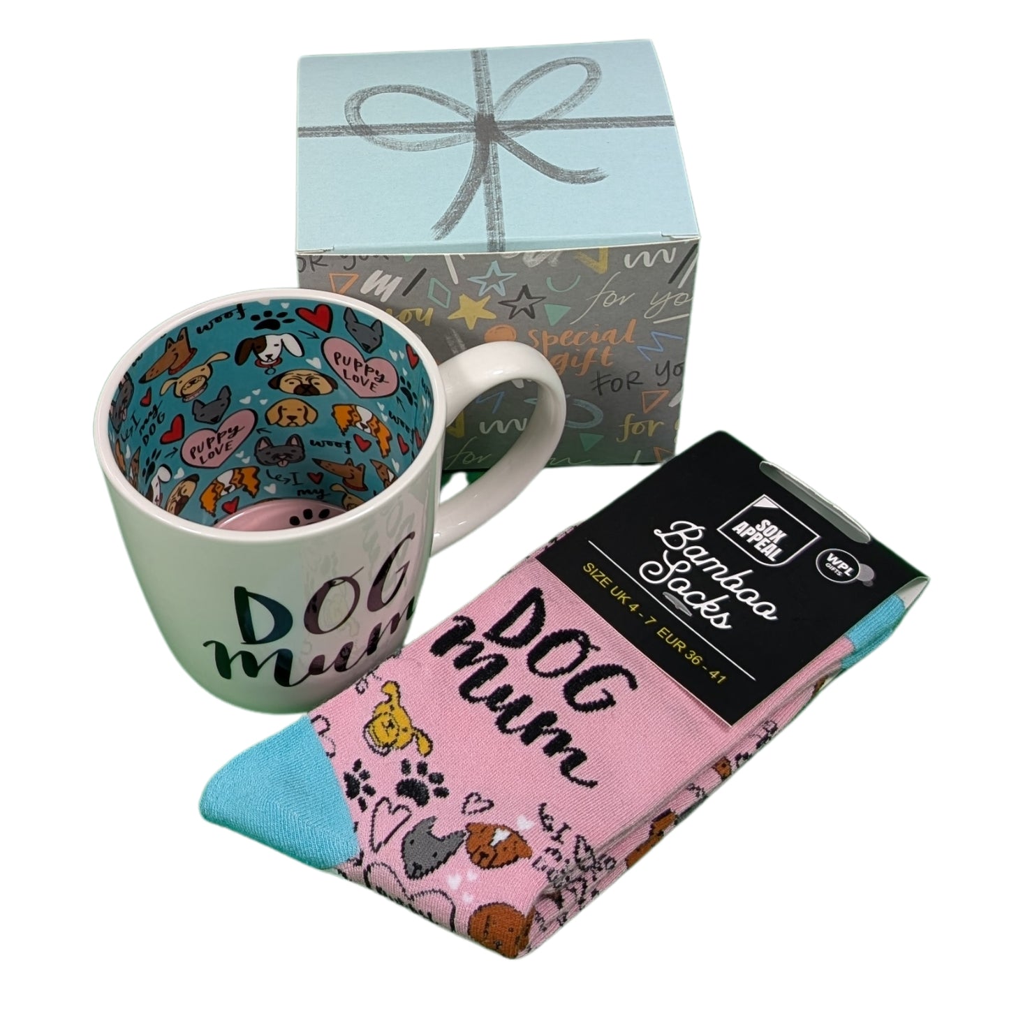 Details: This unique Dog Mum Mug and Socks Set is part of the Inside Out range by WPL Gifts. The set includes a coordinated pink mug and socks with cute pink dog faces, paws, woofs, and puppy love hearts. The caption 'Dog Mum' adds a playful touch. A thoughtful gift for a special pet parent.