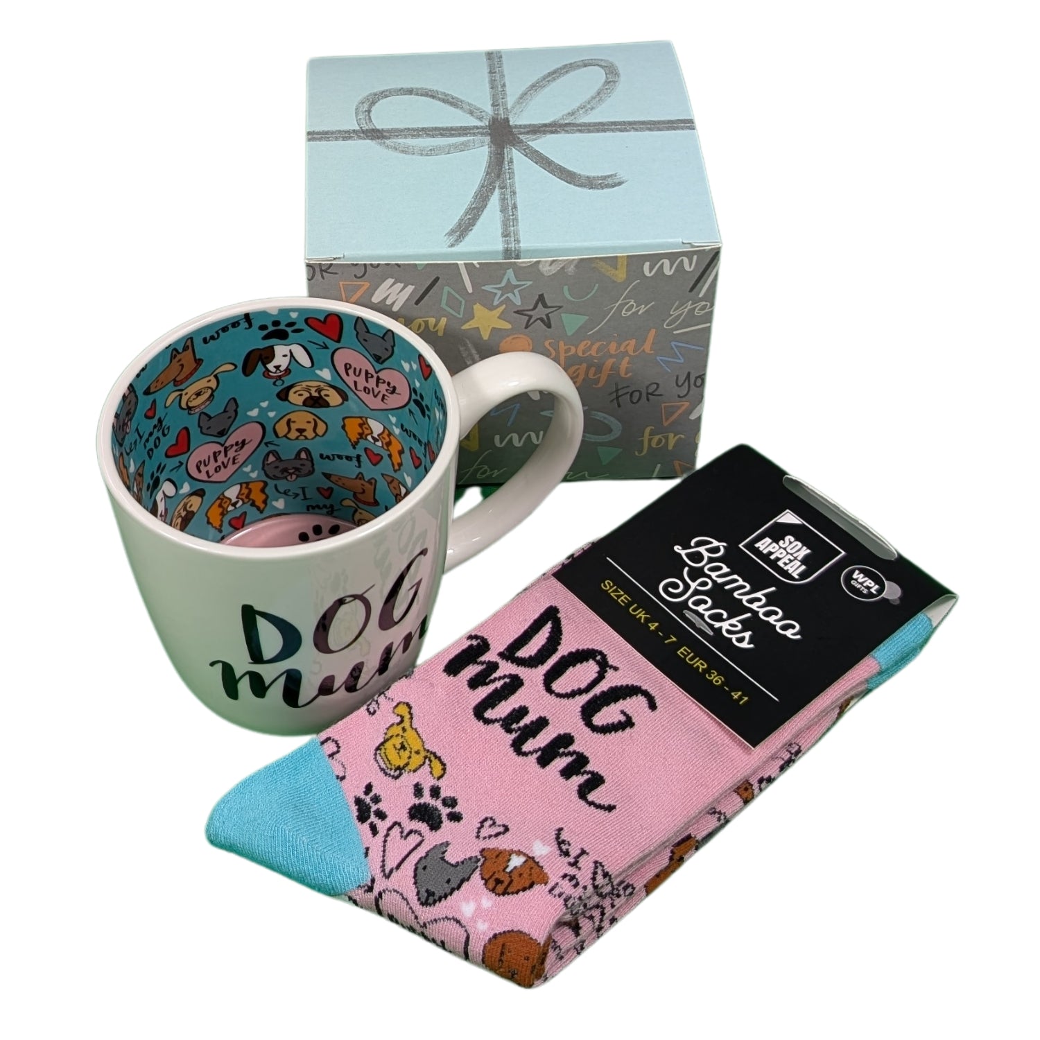 Looking for gift ideas for her? Surprise and delight a special dog mummy with a playful and unique gift featuring coordinated pink mug and socks adorned with cute dog faces, paws, woofs, and puppy love hearts. Capture your thoughtful and heartfelt appreciation for all the love and care they give to their furry best friend with this pawsome gift idea.