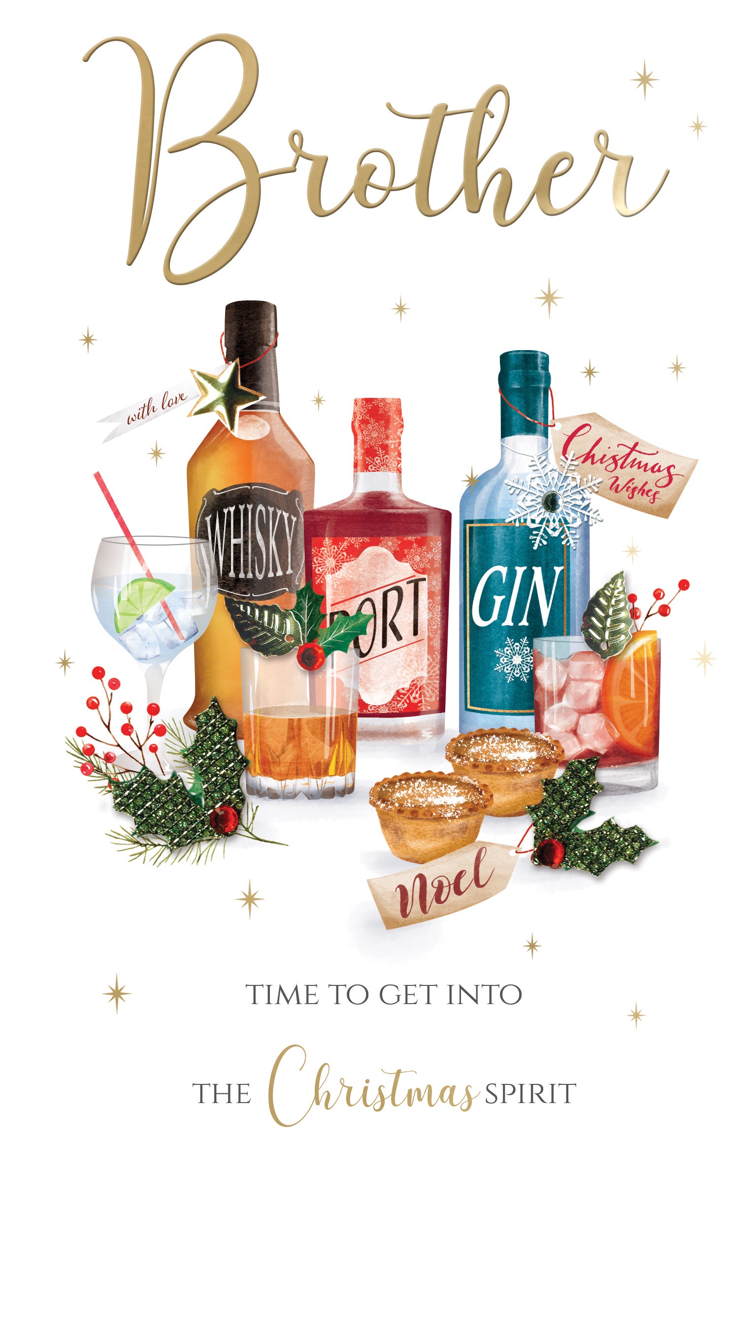 Send Christmas wishes to your special Brother with a charming and exquisitely decorated 'Christmas Spirits' card, celebrating the joy of a festive tipple and making him feel loved.
