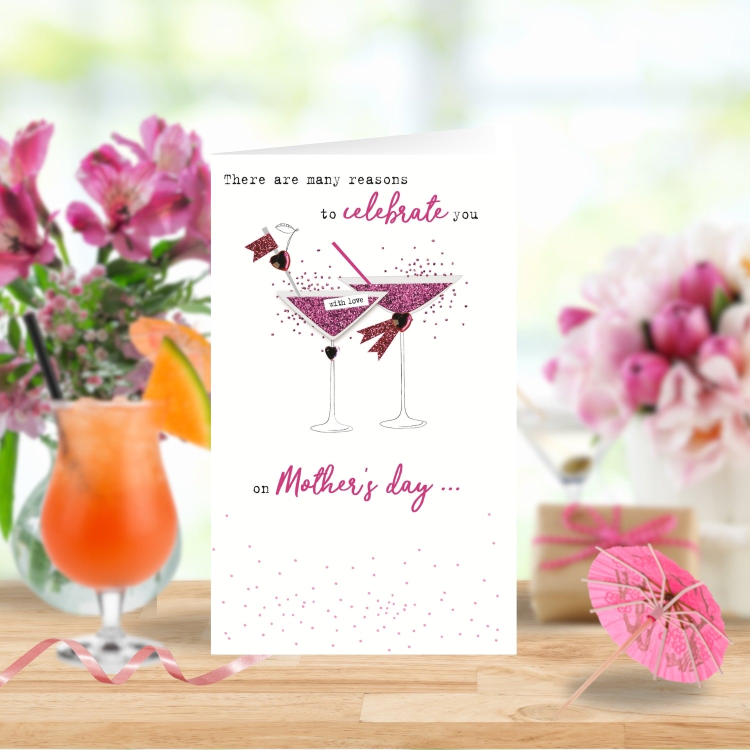 Details: A beautiful glitter hand-finished and embellished Mother's Day greeting card featuring sparkly pink cocktails from Second Nature's Irresistible range