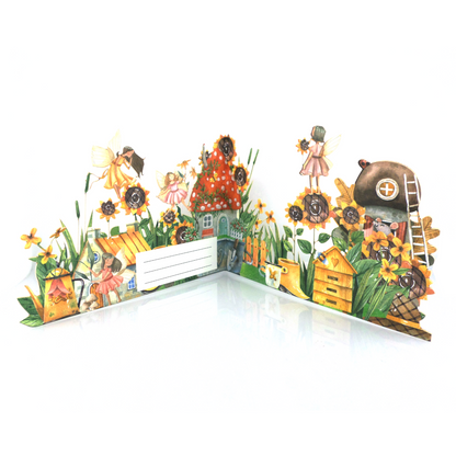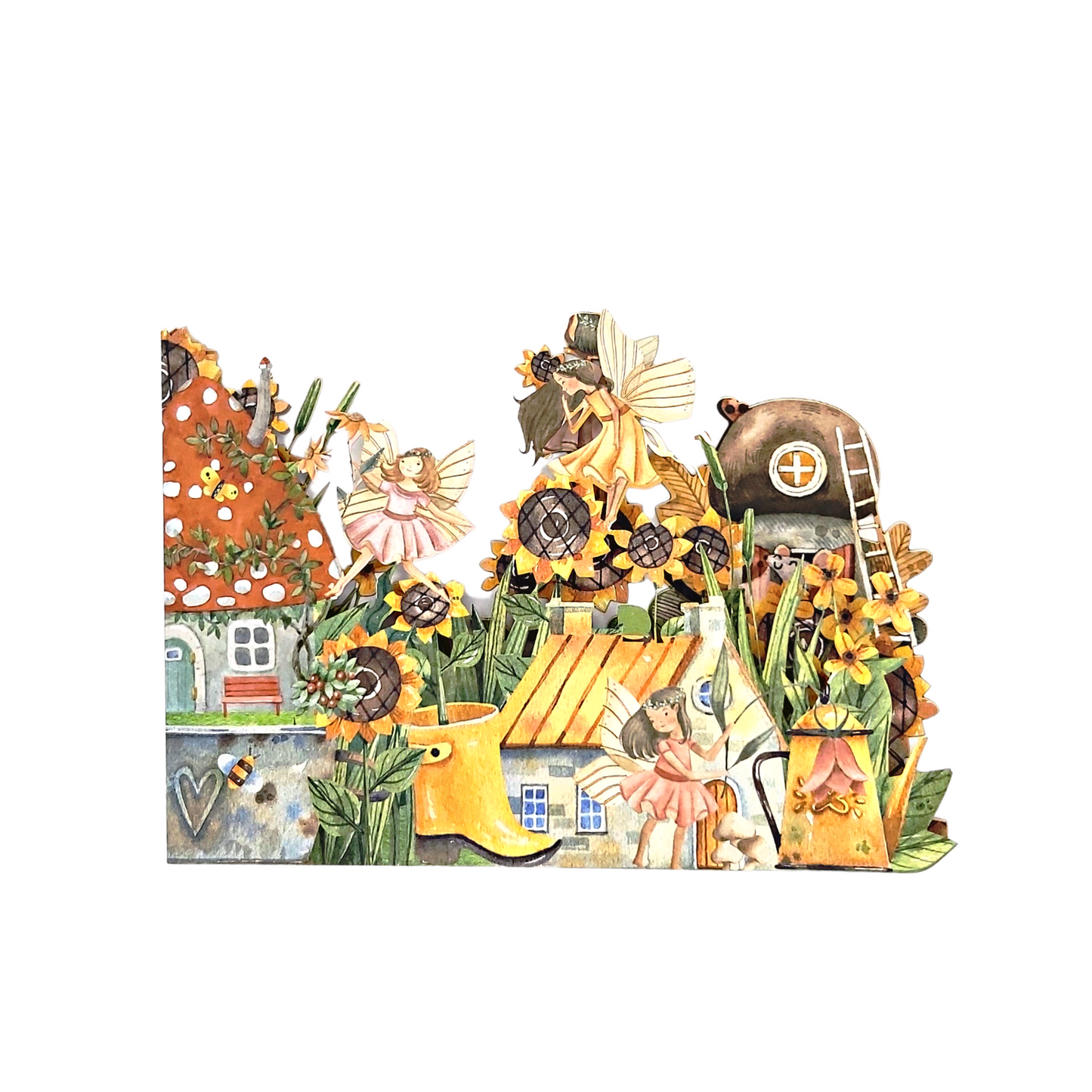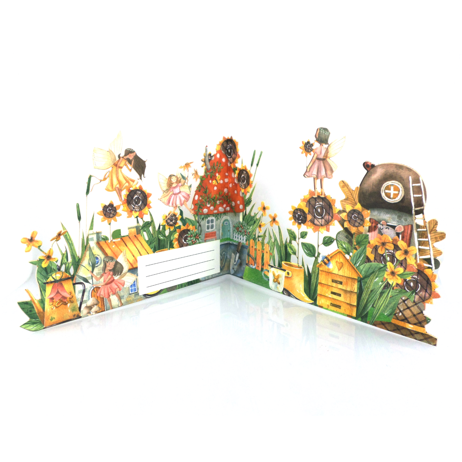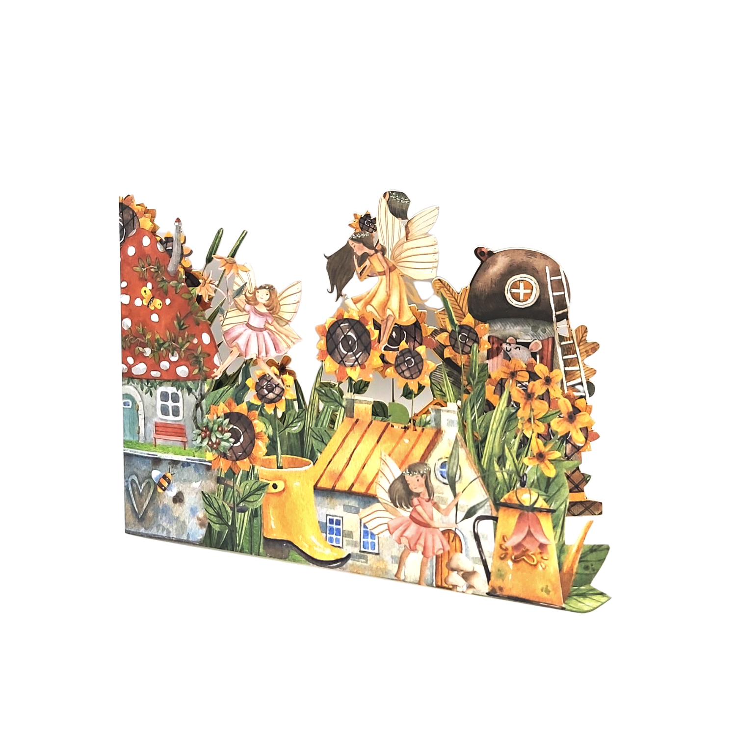 Details: A laser cut pop up greeting card with intricate cut out detailing featuring a fun design of fairies and a fairy house