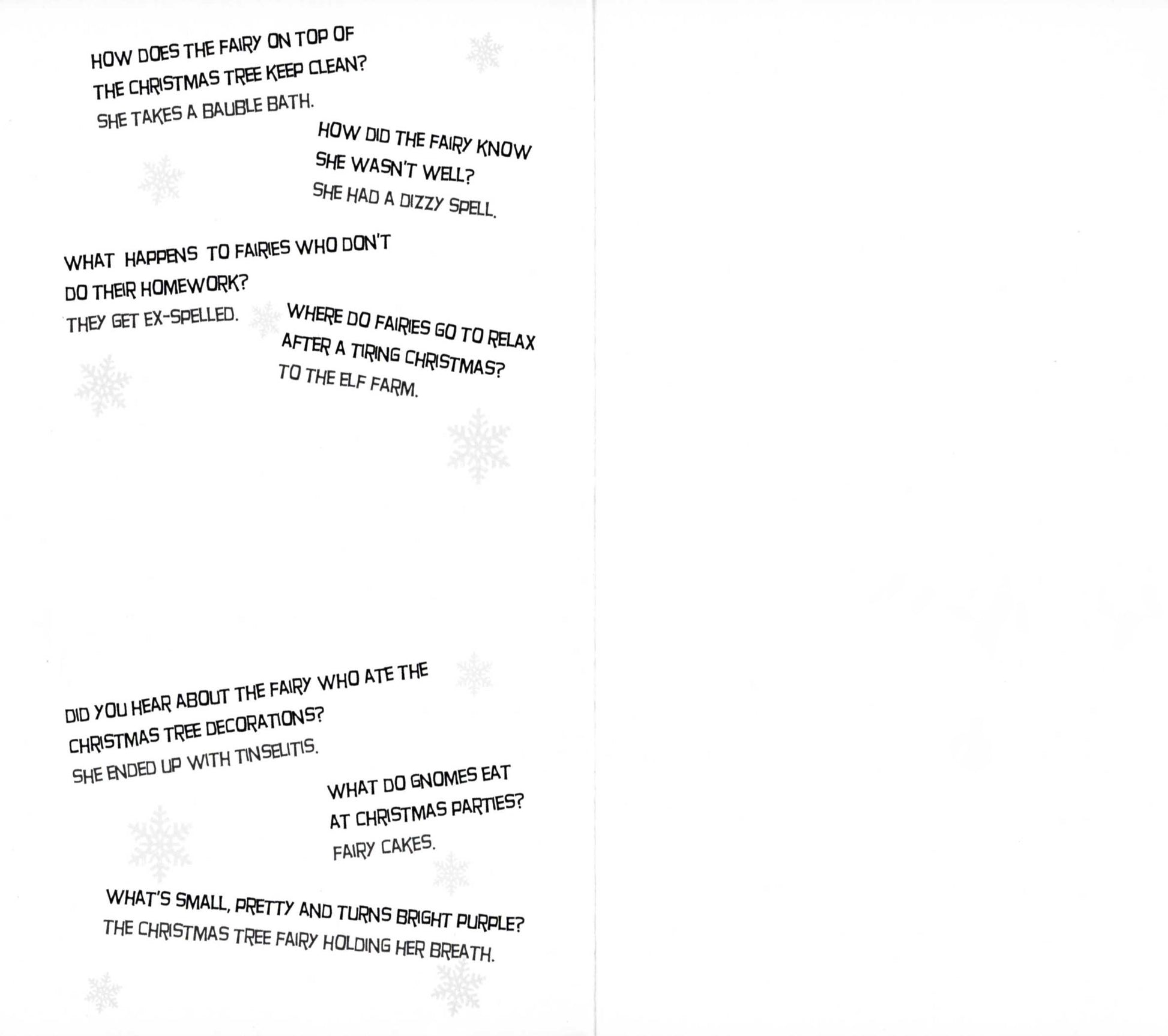 Message Inside: …JOKES SUCH AS…HOW DOES THE FAIRY ON TOP OF THE CHRISTMAS TREE KEEP CLEAN? SHAE TAKES A BAUBLE BATH