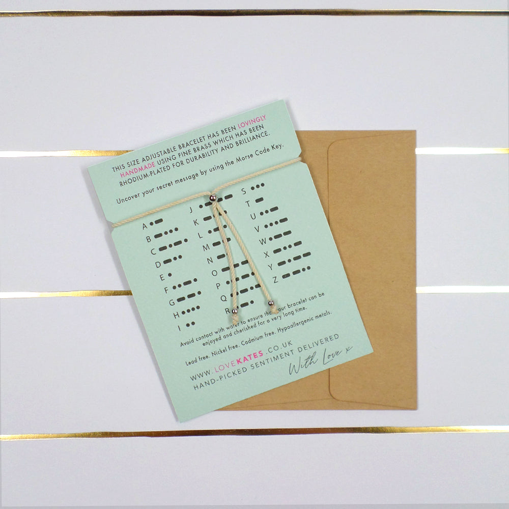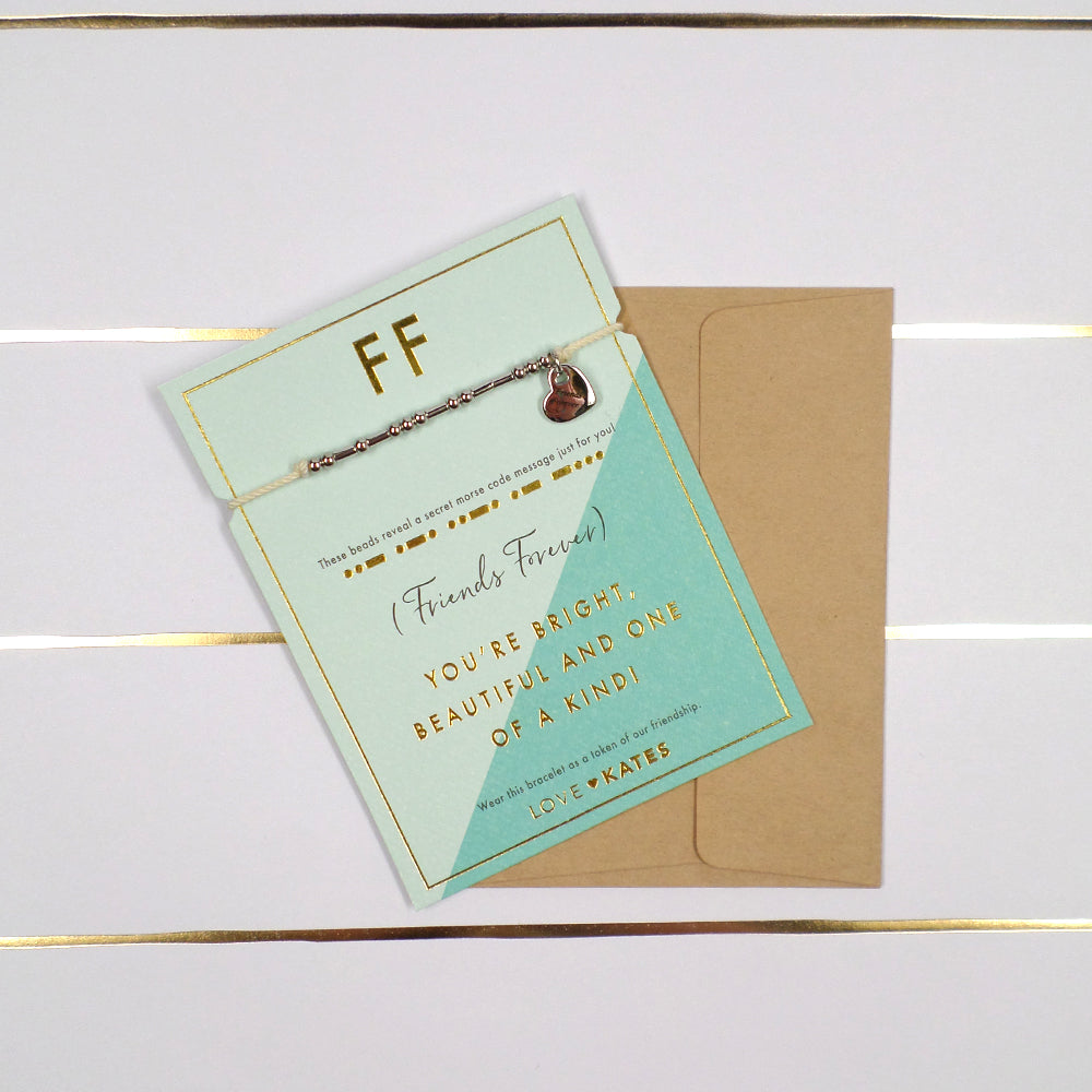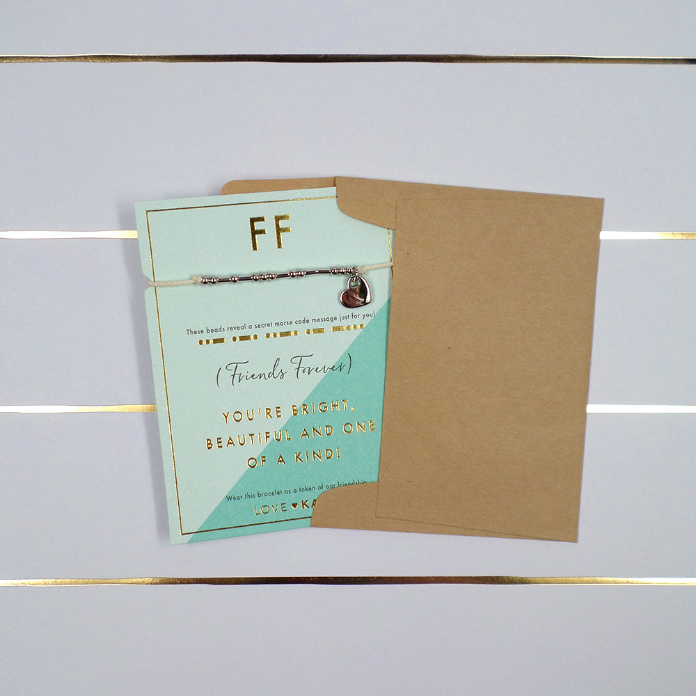 Details: Beautiful keepsake friendship bracelet with a hidden morse code message! Use the key provided to reveal the sentiment* Each bracelet is made of a quality cord with rhodium-plated beads for durability and brilliance. The heart charm is engraved with the message "Friends Forever x" Perfect for any gifting occasion, including birthdays, Christmas, as a stocking-filler or "just because". Mounted on a quality backing card, with an inspirational quote hot stamped in shiny gold foil. Accompanied with a cute craft envelope to post or simply give as a thoughtful gift. Each bracelet is size adjustable. *Once revealed, the morse code message reads "U R FAB".