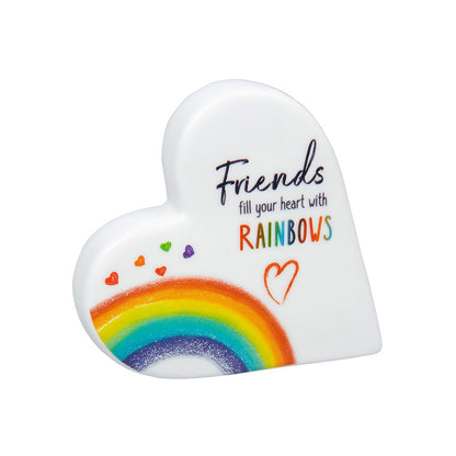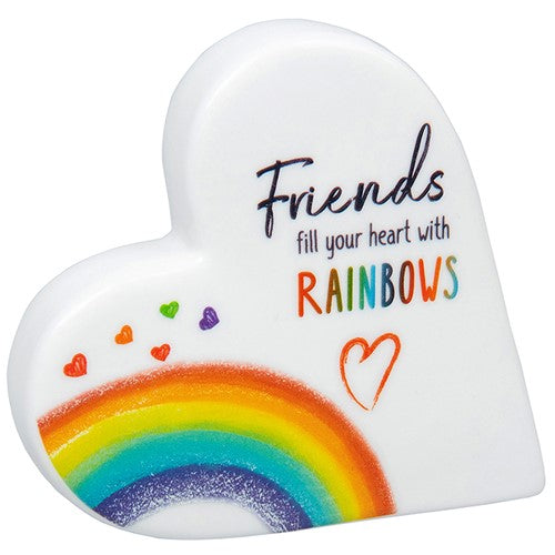Details: A bright and colourful ceramic standing heart from our feel-good 'Rainbow Graphique' range. This gorgeous ornament includes a heartfelt message for a loved one and a colourful lucky rainbow. Each standing heart comes in a colourful gift box.