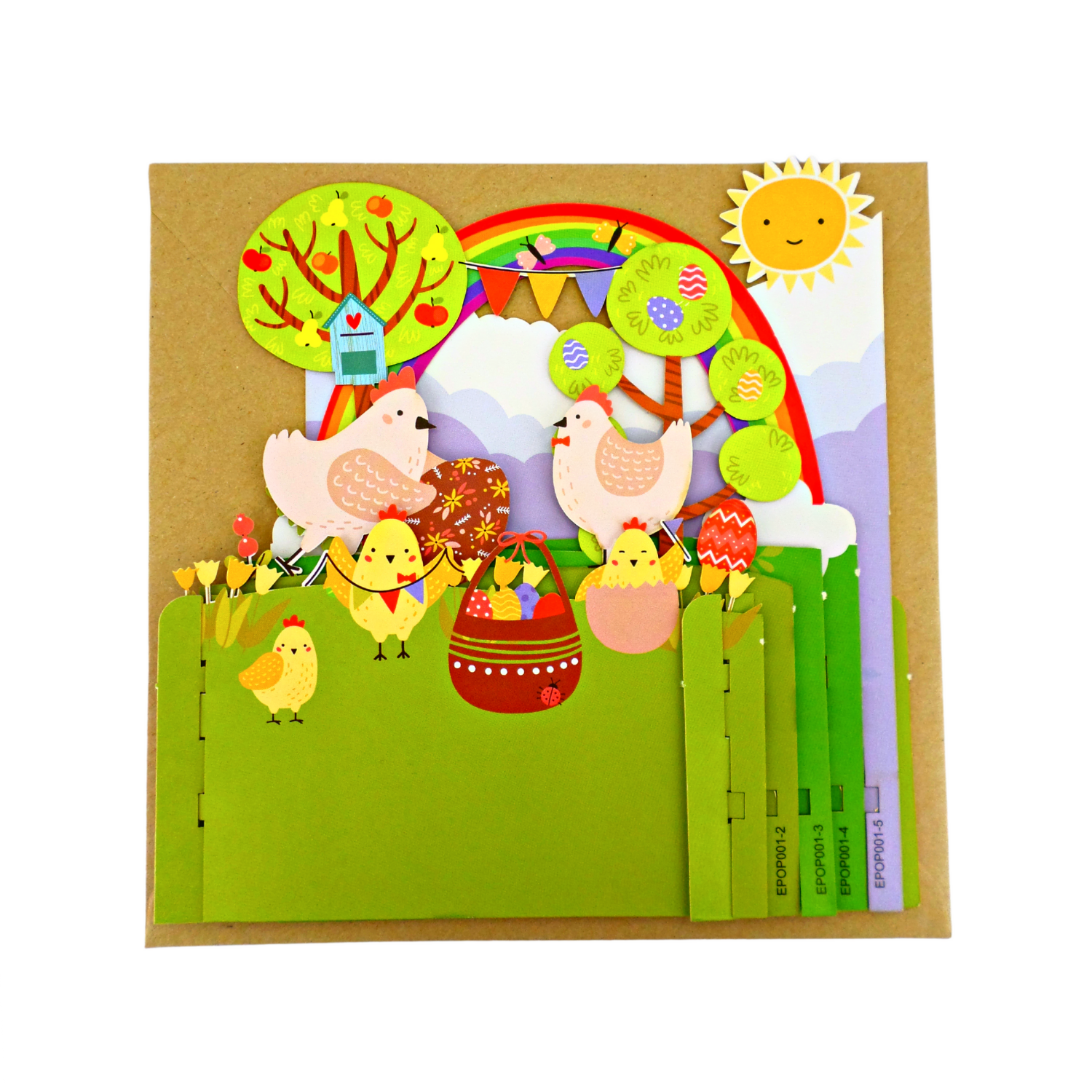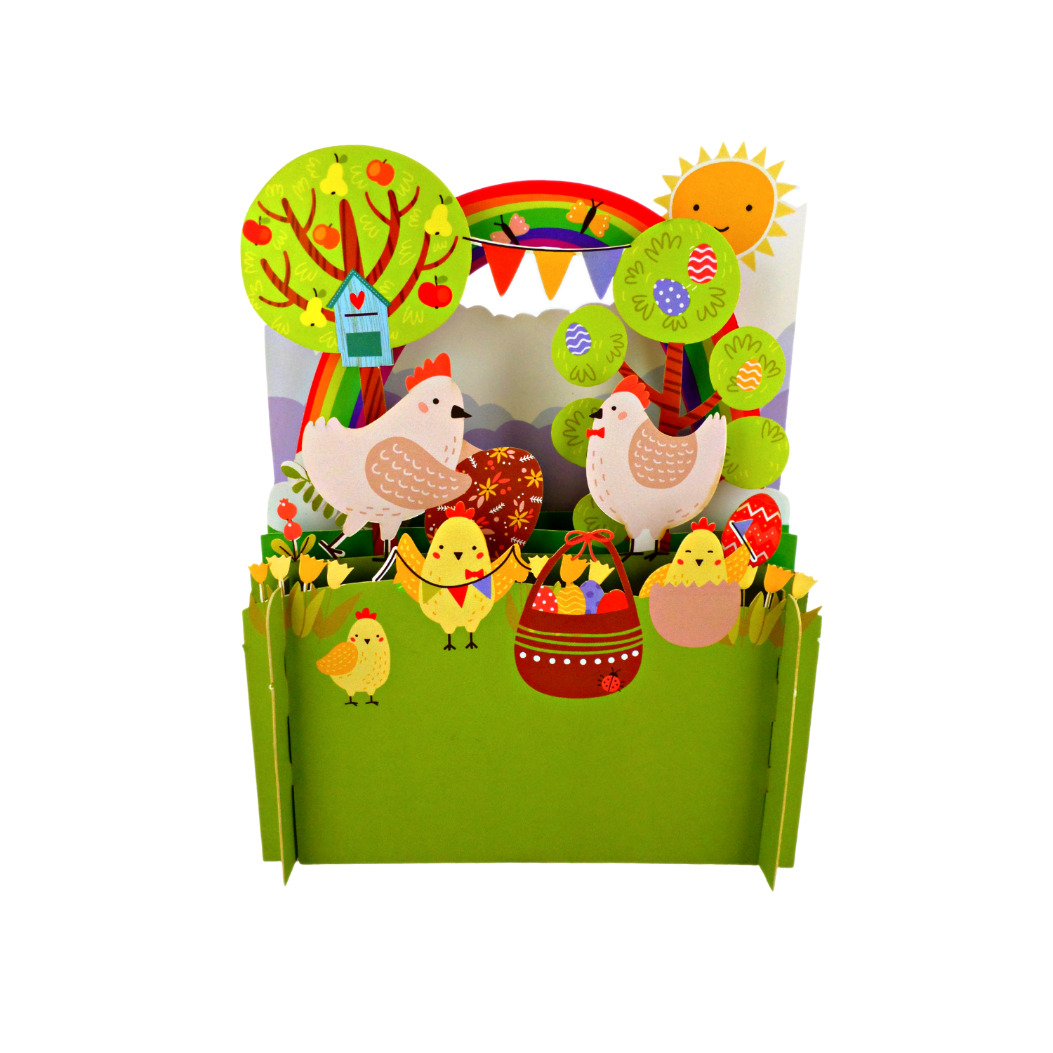 Details: A laser cut pop up greeting card with intricate cut out detailing featuring a fun design of Easter chicks and a magical rainbow