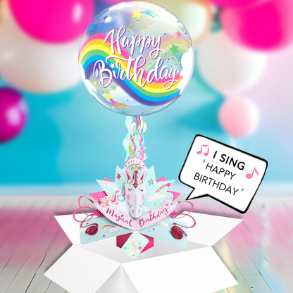 Contents: A large 16” helium-inflated bubble balloon with a ribbon and tissue paper tassel tail floats from a box filled with vibrant tissue and confetti. The balloon is anchored with a personalised pop-up card, creating the ultimate celebration surprise.