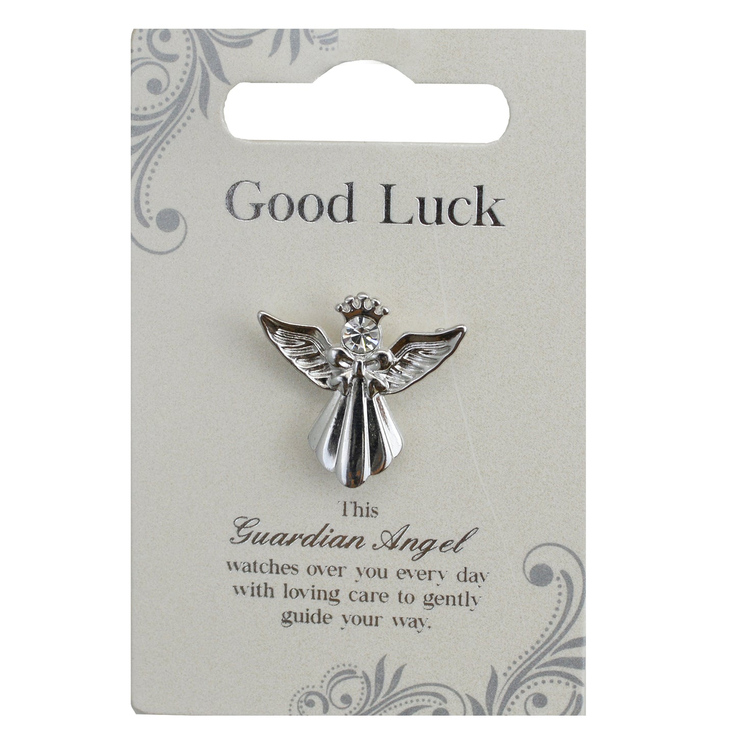 Details: A silver coloured angel pin presented on a backing card