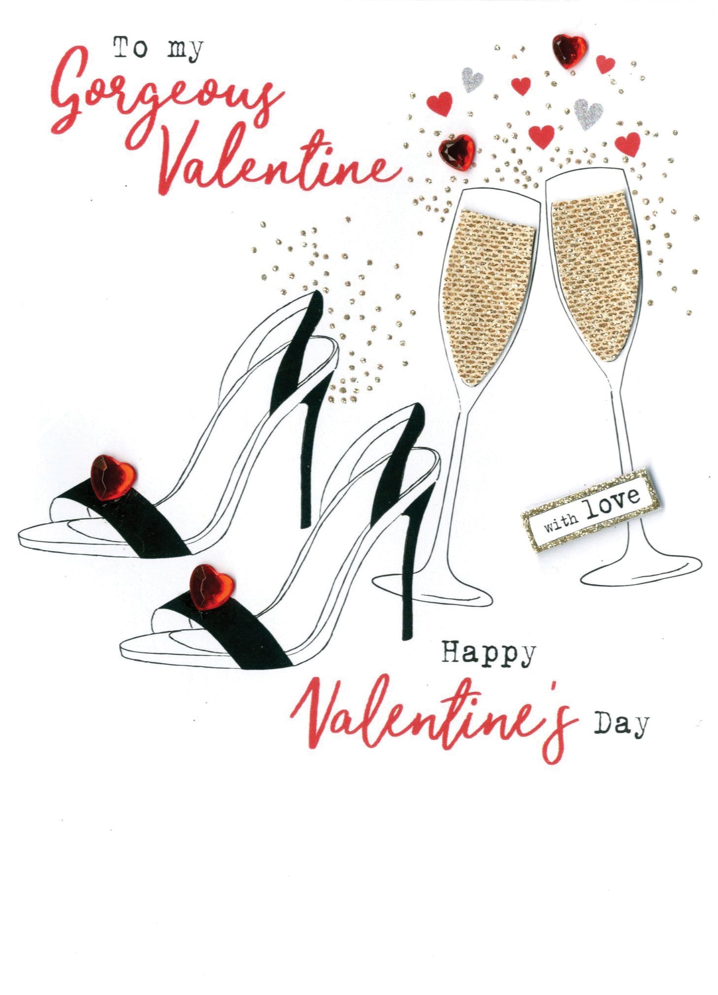 Details: A quality hand-finished embellished Valentine's Day greeting card by Second Nature featuring stylish high heels and champaign glasses