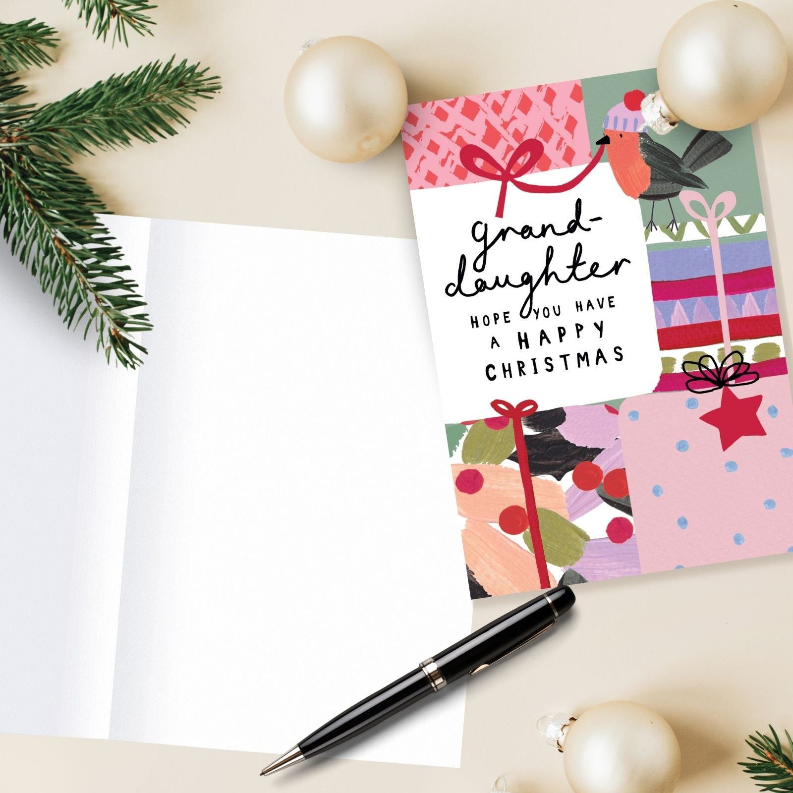 Details: This beautifully illustrated card from the Kindred range by UK Greetings is designed for a granddaughter. It showcases a whimsical, hand-painted robin in a bobble hat perched on wrapped gifts. Featuring the warm message, 'Granddaughter Hope you have a Happy Christmas.' A vibrant and festive greeting.