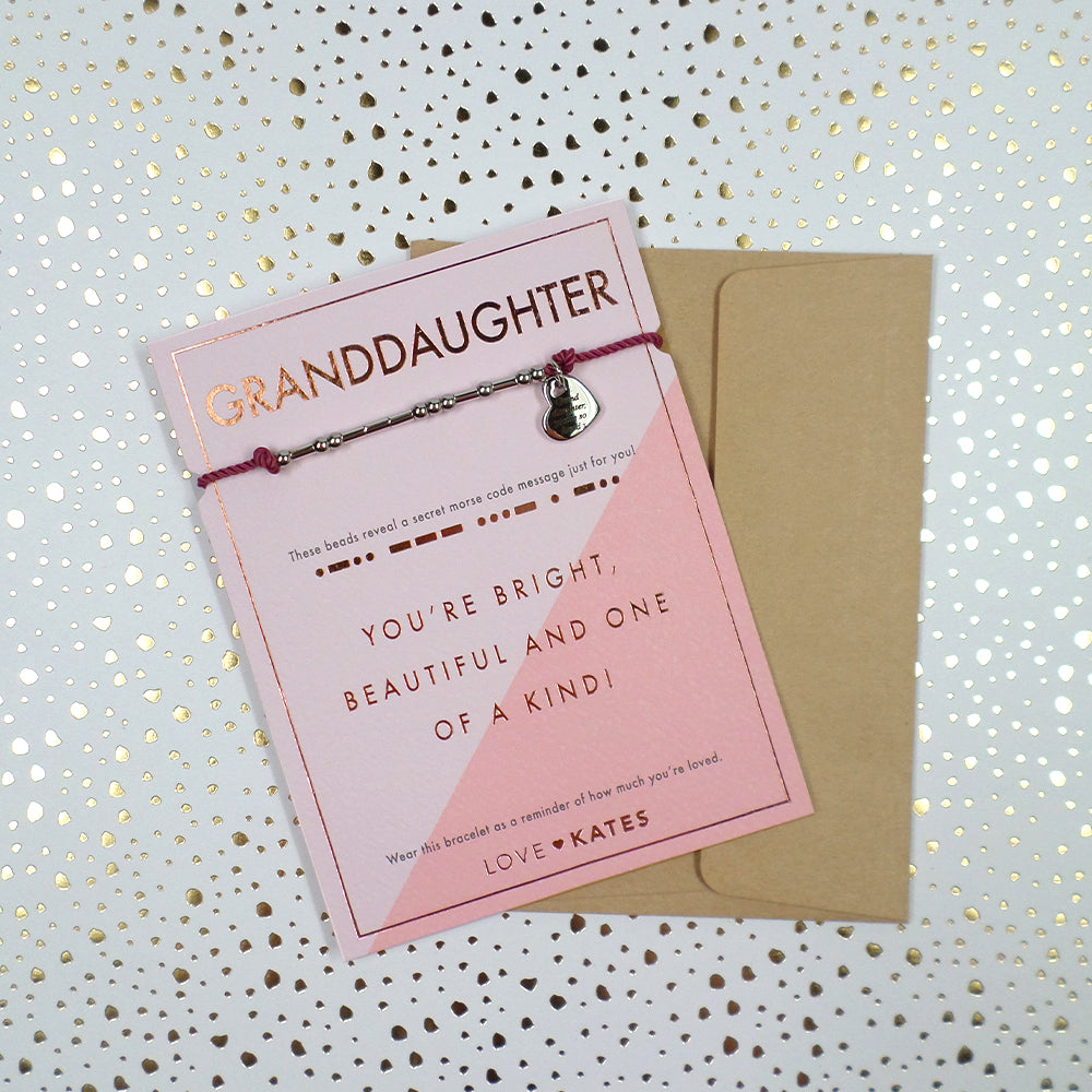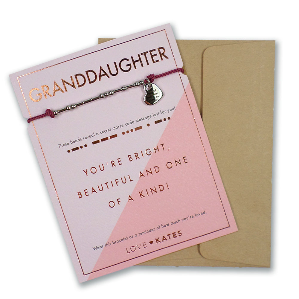 Caption: GRANDDAUGHTER These beads reveal a secret morse code message just for you! YOU'RE BRIGHT, BEAUTIFUL AND ONE OF A KIND