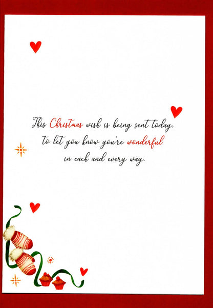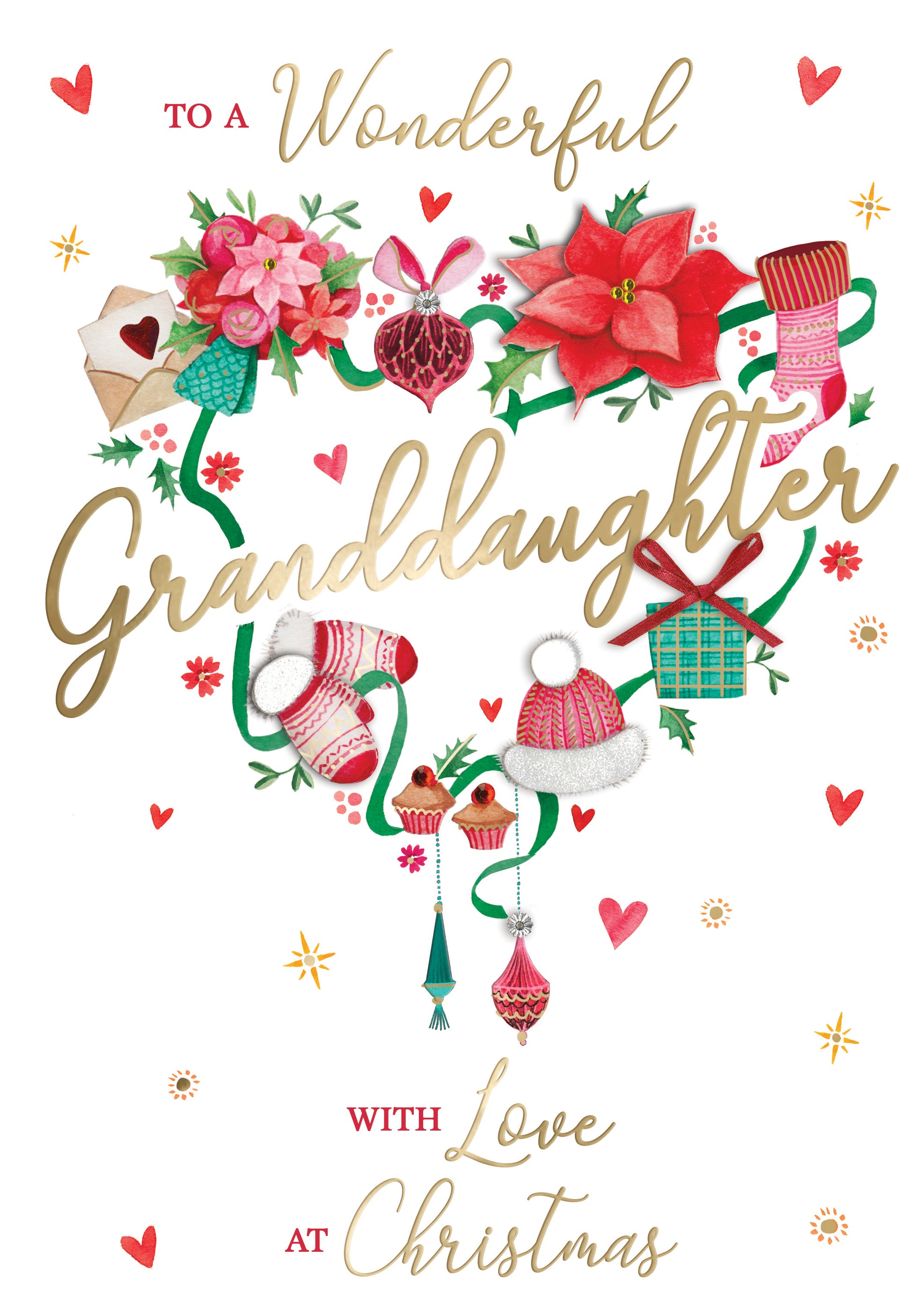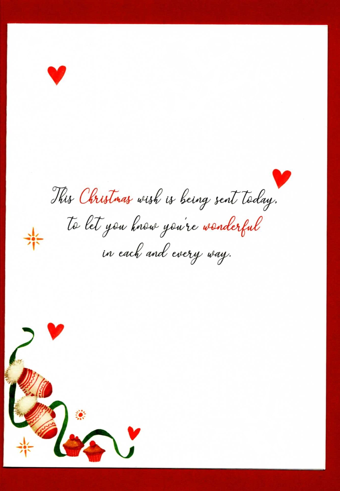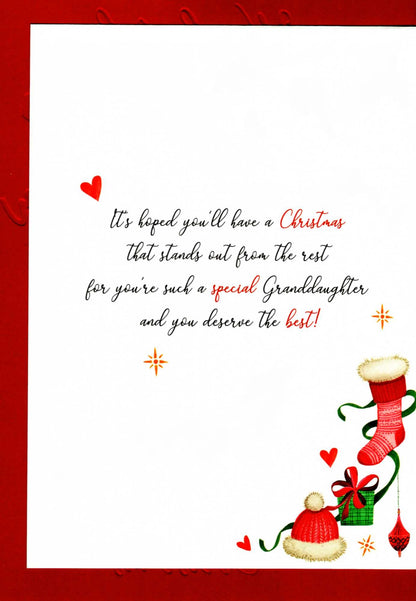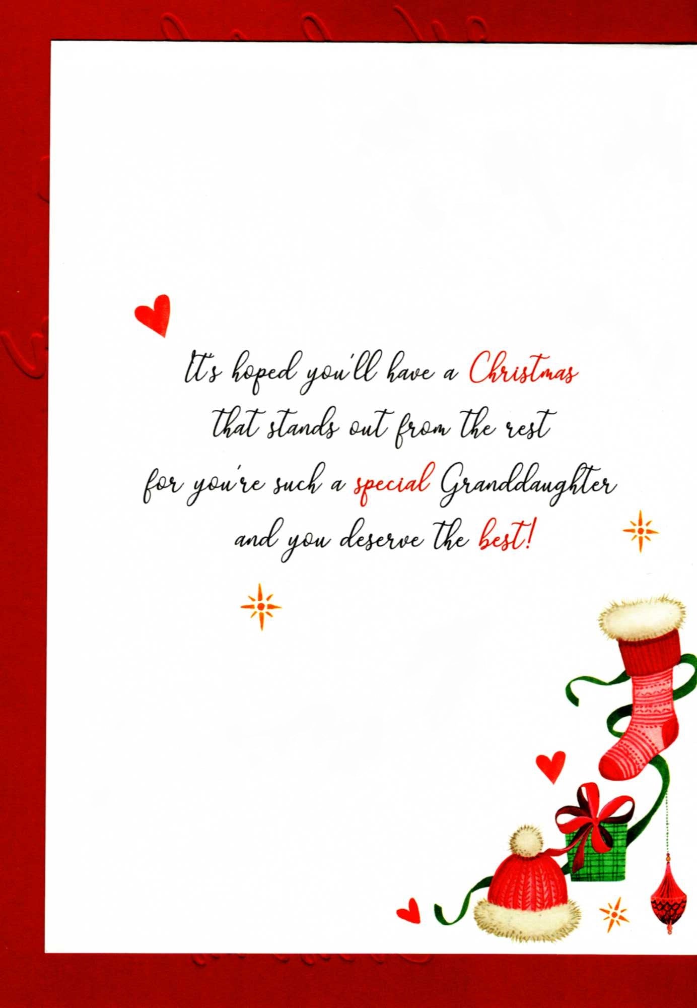 Message Inside: This Christmas wish is being sent today, to let you know you're wonderful in each and every way. It's hoped you'll have a Christmas that stands out from the rest for you're such a special Granddaughter and you deserve the best! May this Christmas bring you everything you could wish for! With lots of love