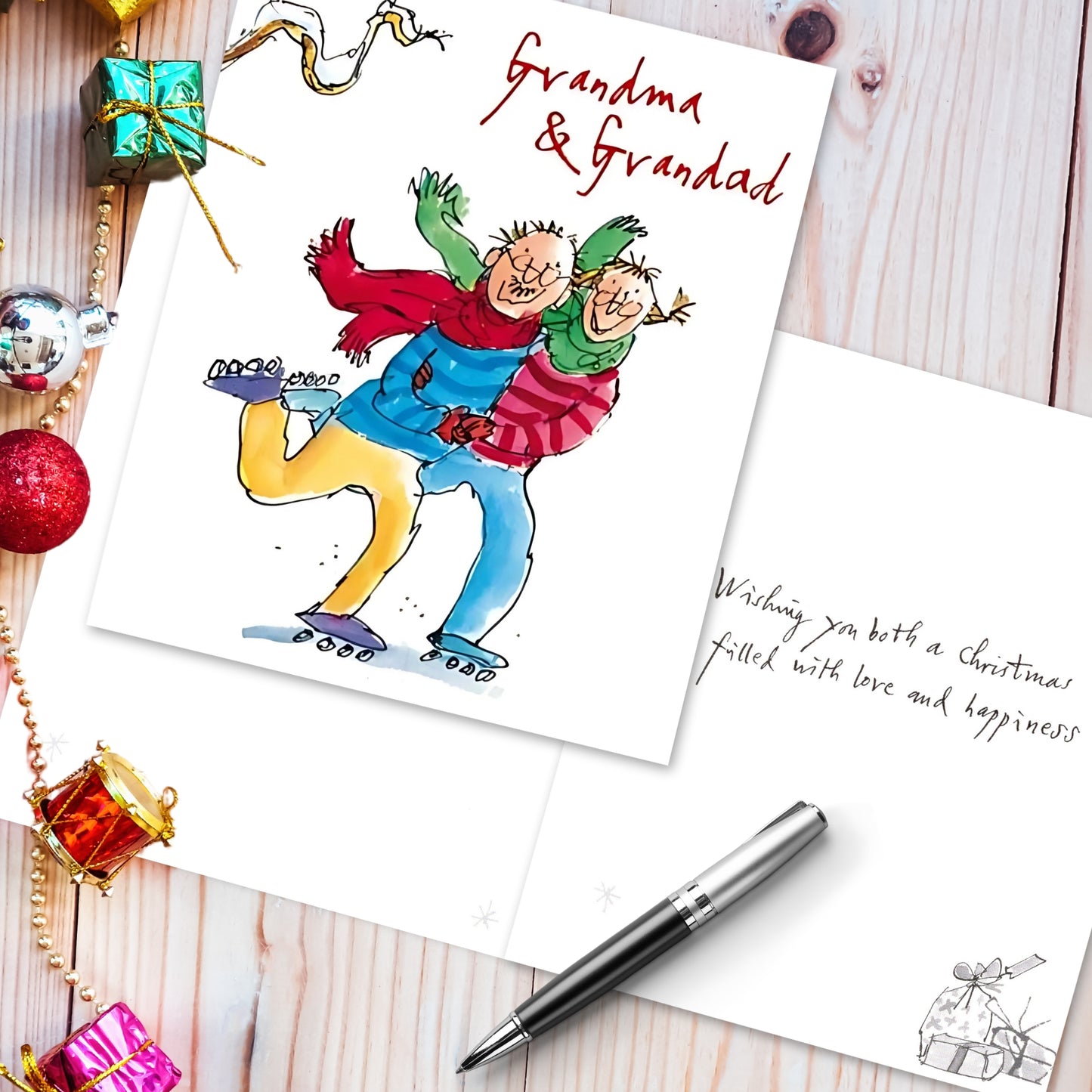 Looking for a heartfelt Christmas card idea for your grandparents? This enchanting Quentin Blake card of an adorable illustration of Grandma and Grandad captures the love and joy of grandparents, guaranteed to brighten their day and fill their hearts with warmth this magical season!
