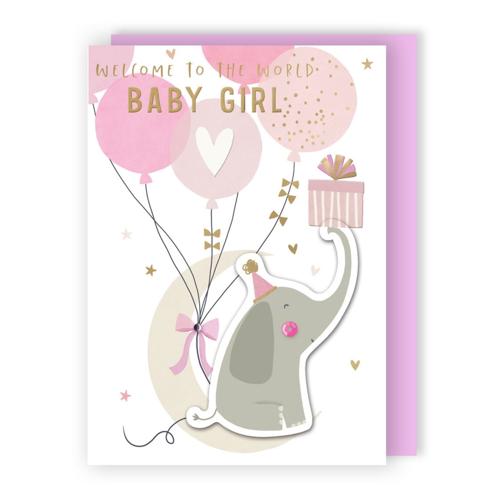 Looking for new baby greeting card ideas for her? This enchanting card captures the joy of welcoming a new baby girl with its delightful design of a baby elephant, balloons, and heartfelt message. The charming embellishments, including sparkling gems, add a special touch, making it a perfect way to celebrate and share in the happiness of new beginnings.