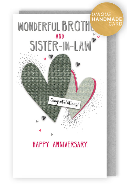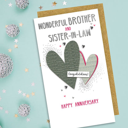Looking for greeting card ideas for ? Celebrate the love between a Brother & Sister-In-Law with this beautiful hand-finished anniversary card, adorned with hearts. Show them you care and make their special day even more memorable.