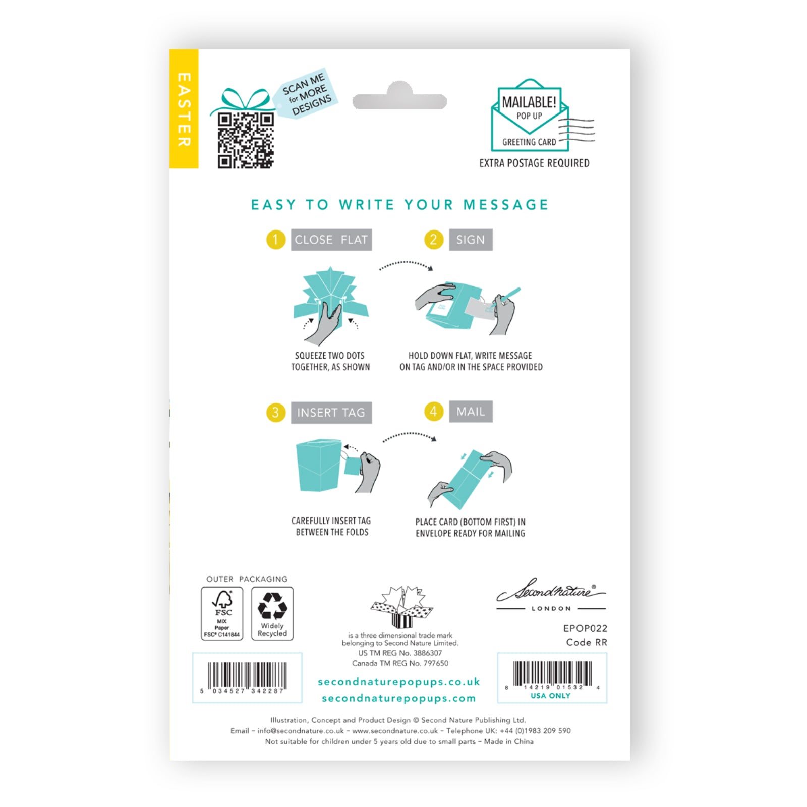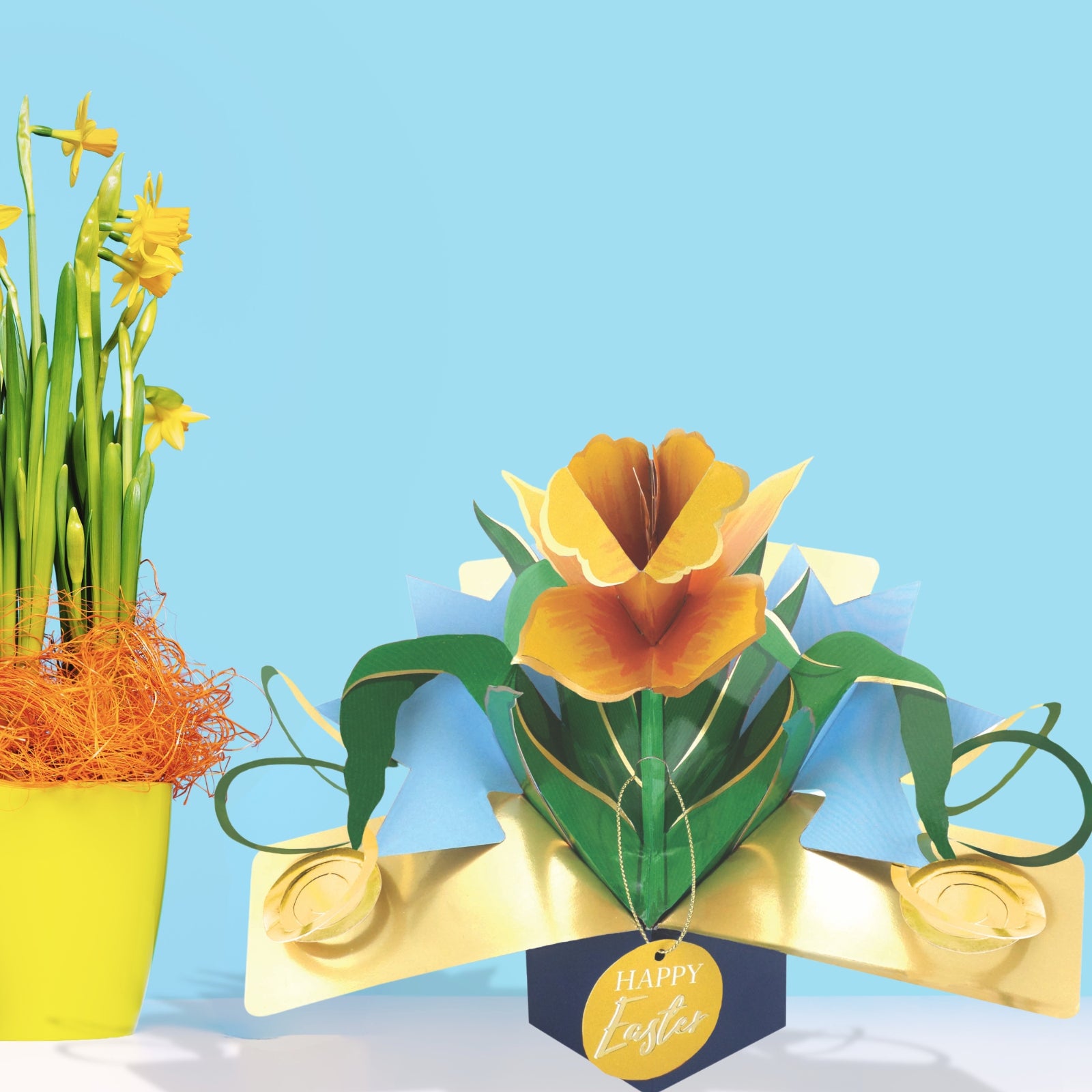 Details: This delightful pop-up card, part of the Second Nature Pop Ups range, showcases a beautifully crafted yellow and gold daffodil. Adorned with the cheerful message 'Happy Easter', it is designed to bring joy and warmth to someone special, making it a perfect seasonal greeting for loved ones.