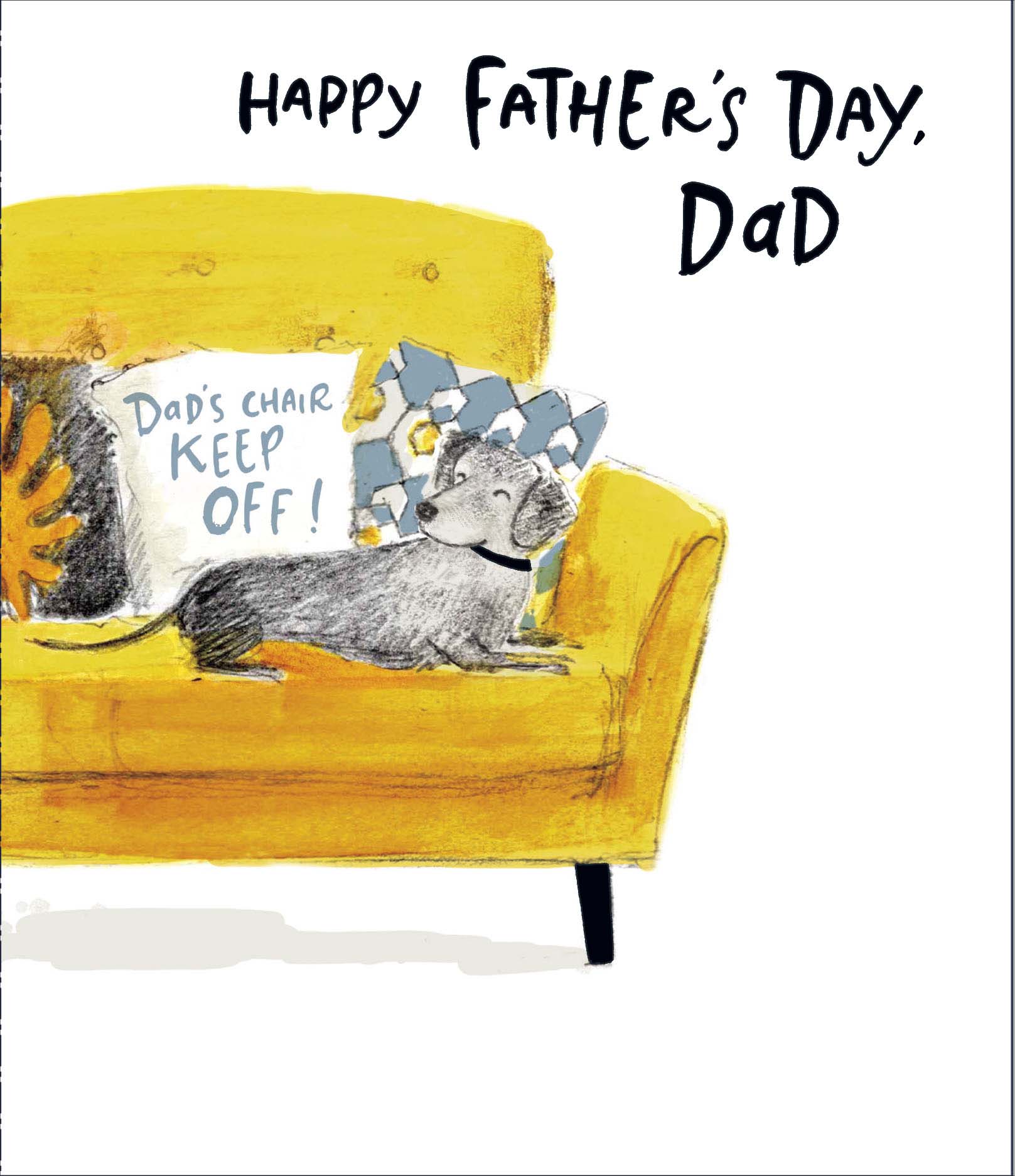 Details: A funny and cute illustrated Father's Day greeting card featuring a dog sitting in dad's chair by Carlton Cards with a colourful embossed finish