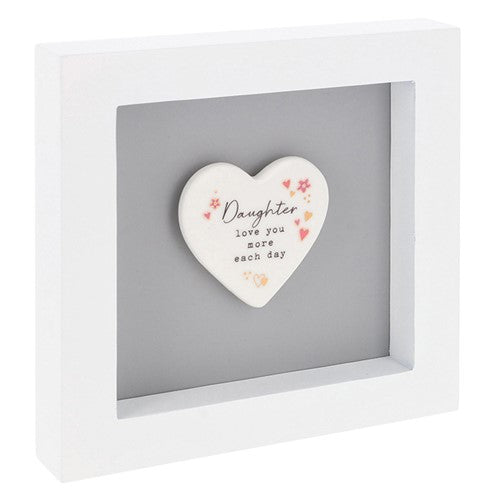 Details: This collectible plaque from the Heartfelt Art range is designed with pink hearts and the heartfelt caption "Daughter love you more each day." It is a special gift that will make any daughter feel loved.