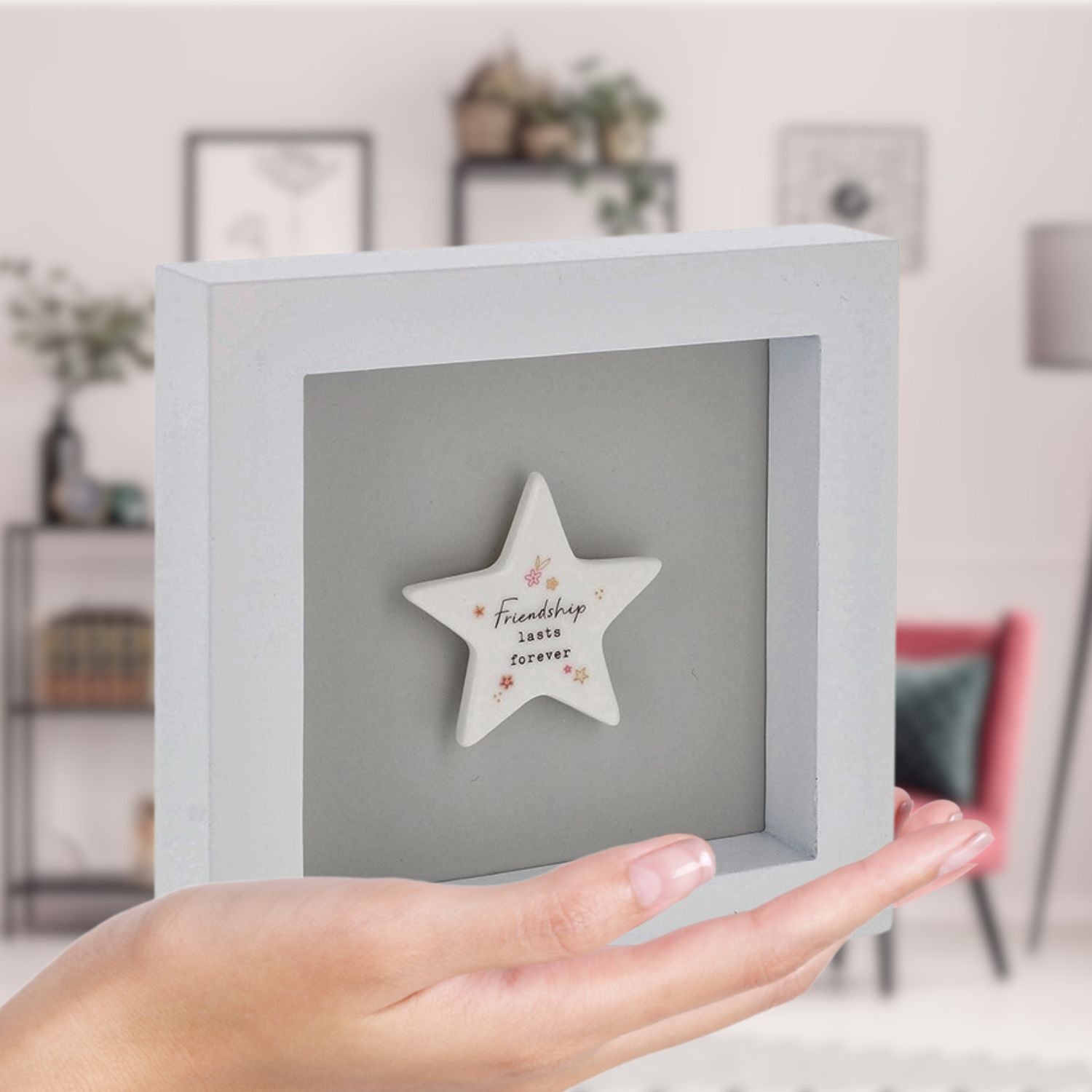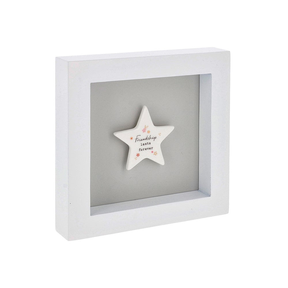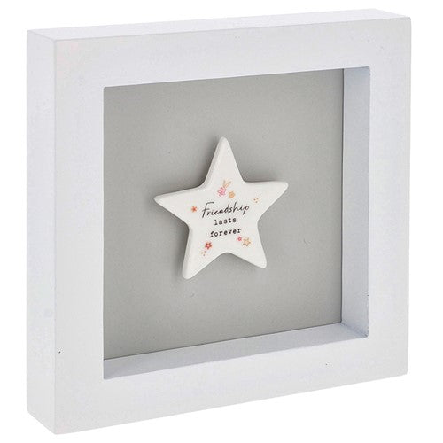 Details: This collectable plaque from the Heartfelt Art range is a thoughtful gift idea. It features a star-shaped design with pink flowers and the caption 'Friendship lasts forever'. This plaque is sure to make a special friend feel truly magical.