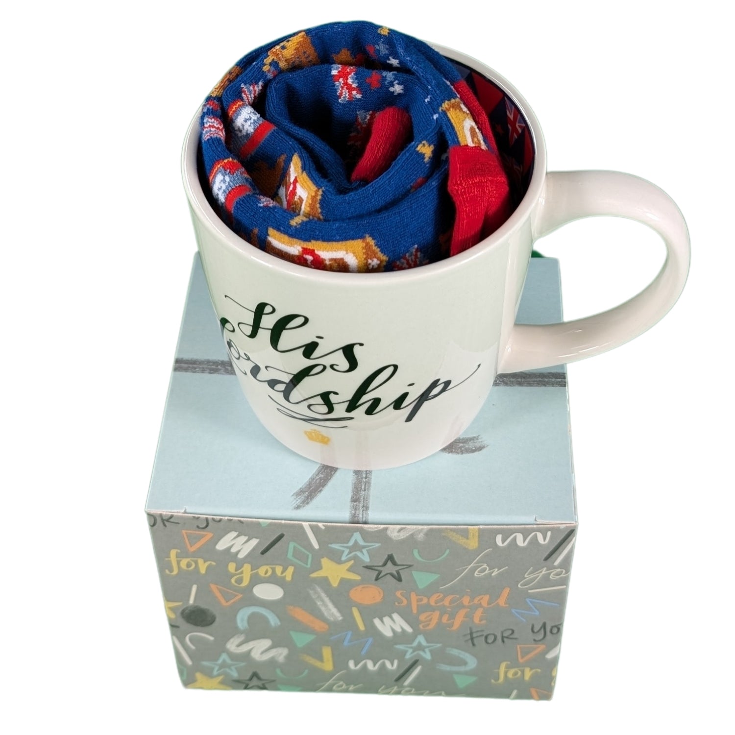 Looking for gift ideas for him? This exquisite gift set captures the essence of regality and British pride, with its coordinated blue mug and socks adorned with royal icons, flags, and majestic symbols. It's the perfect surprise for that special someone who deserves to feel like royalty.