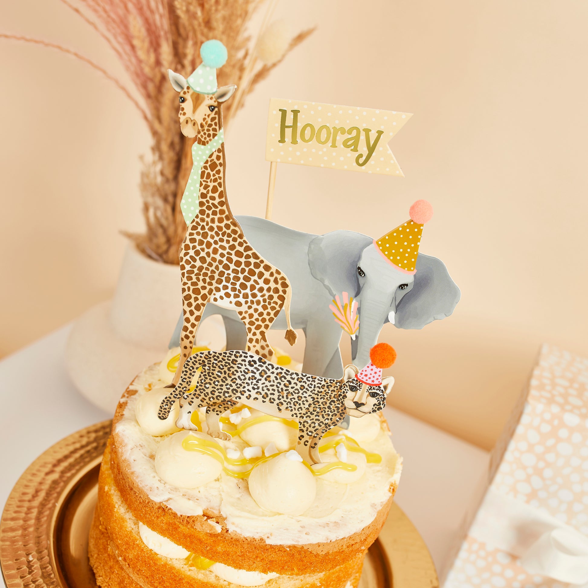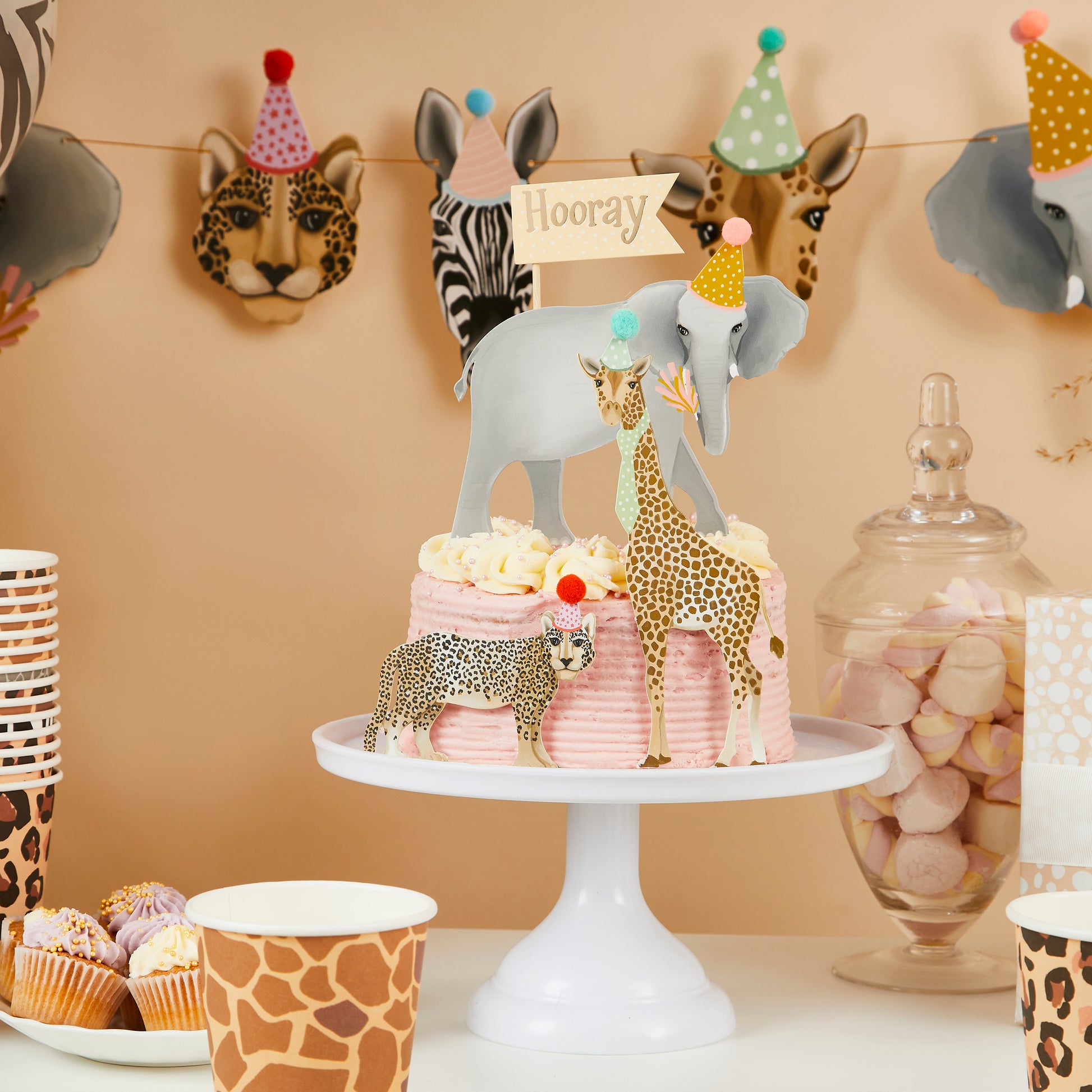 Details: This playful cake topper set features adorable giraffes, elephants, and leopards wearing party hats. Designed by Hootyballoo, it's the perfect addition to any safari-themed celebration. Guaranteed to bring a playful touch to any special occasion.