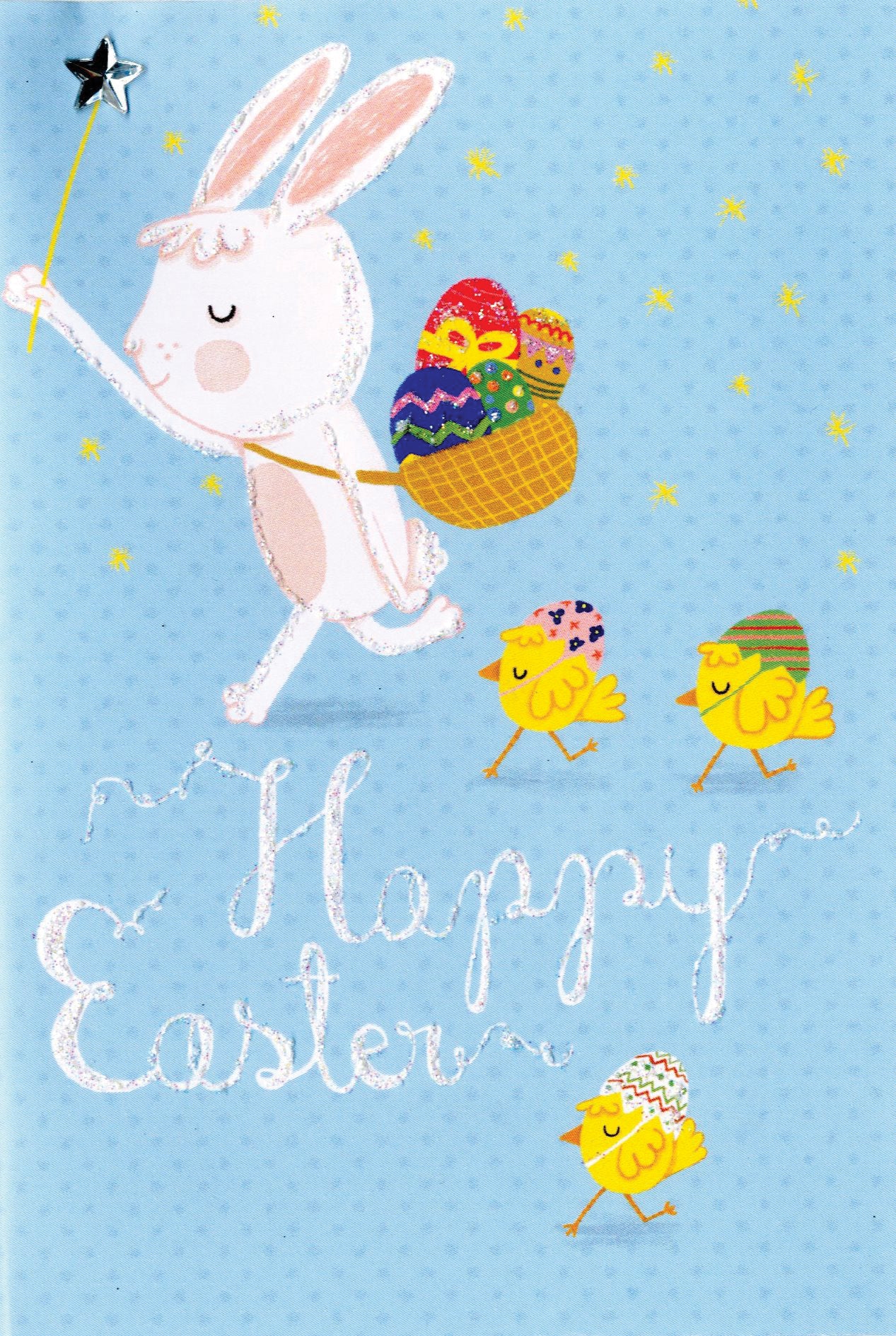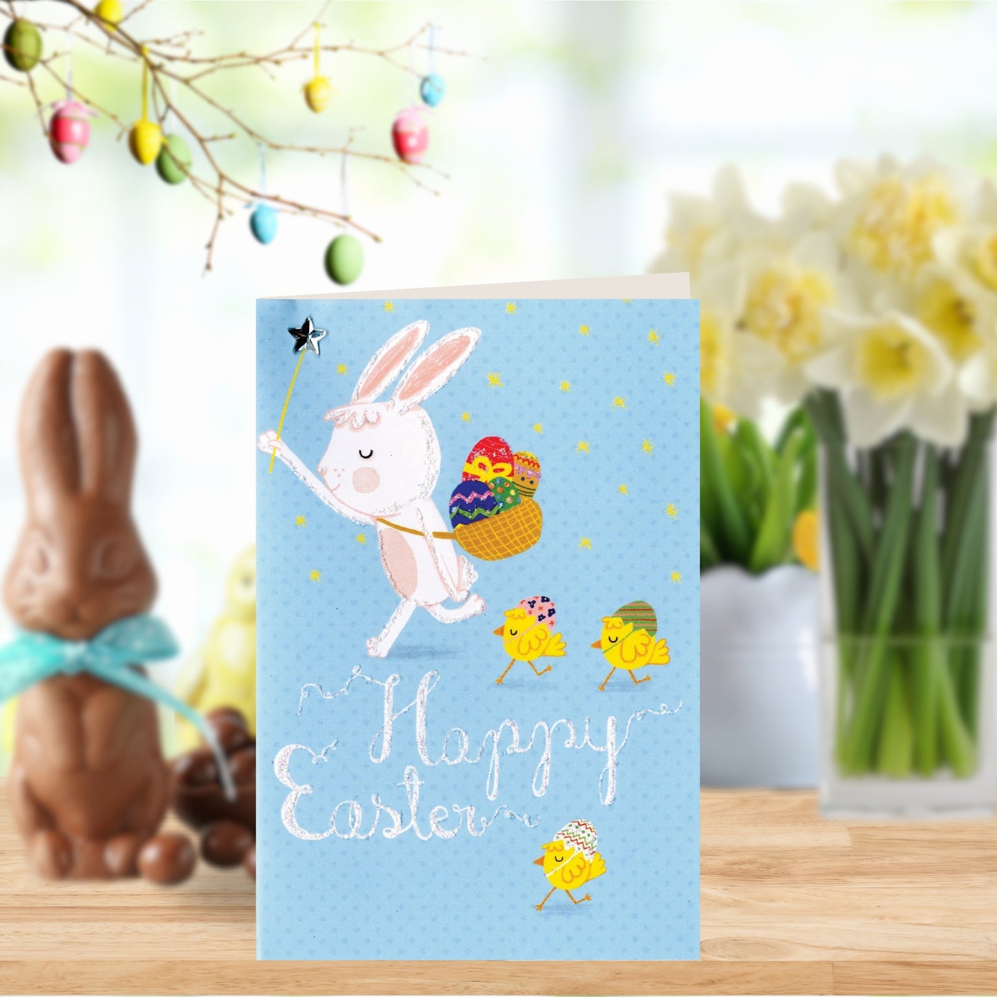 Details: A lovely hand-finished, glitter-embellished Easter greeting card by Second Nature featuring a rabbit with a magic wand carrying a basket of eggs
