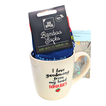 Details: The I Love Gardening Mug and Socks Set For Him is a playful and thoughtful gift. Designed by WPL Gifts, this set includes a coordinated mug and socks featuring green gardening icons and the caption 'I Love Gardening From My Head Tomatoes'. The perfect gift to make someone feel special.