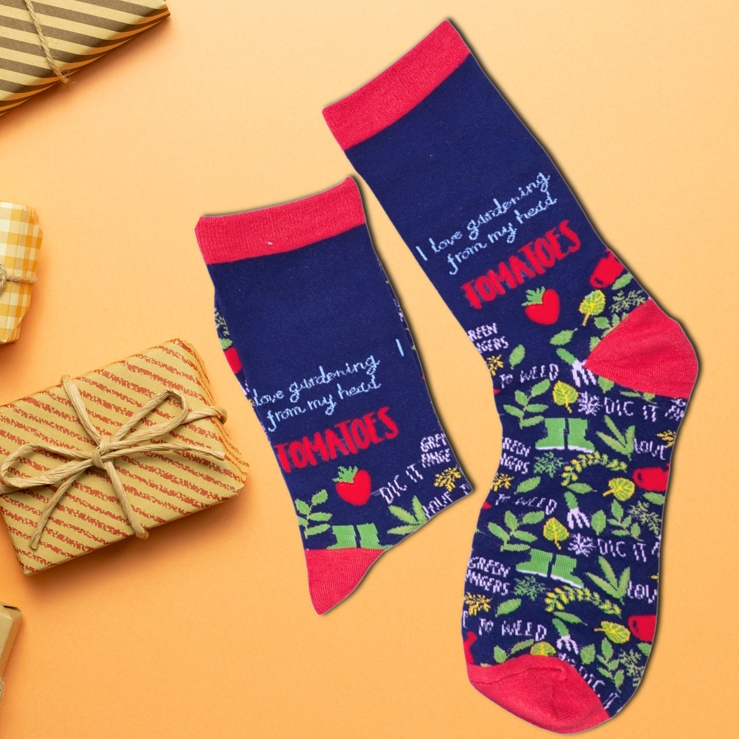 Looking for gift ideas for him? These delightful gardening socks are a whimsical and thoughtful gift, designed to bring joy and delight to a special person's heart. The playful design, featuring the phrase "I love gardening from my head tomatoes" and charming green gardening icons, captures the essence of a love for gardening. Surprise your loved one with this unique and collectible gift, sure to bring a smile to their face.