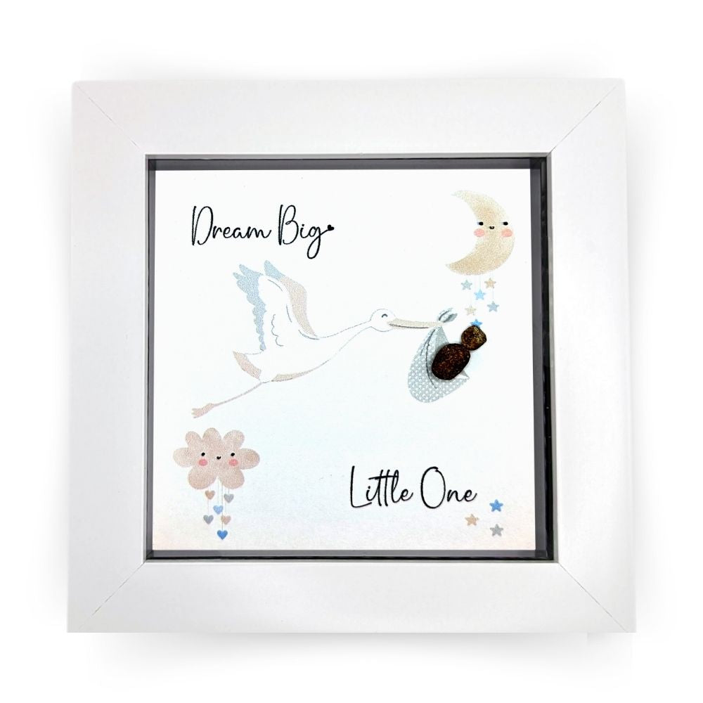 Details: This handmade framed print from La De Da! features a heron carrying a baby with the caption 'Dream Big Little One'. It's a part of the La De Da! range and would make a thoughtful gift for someone special.