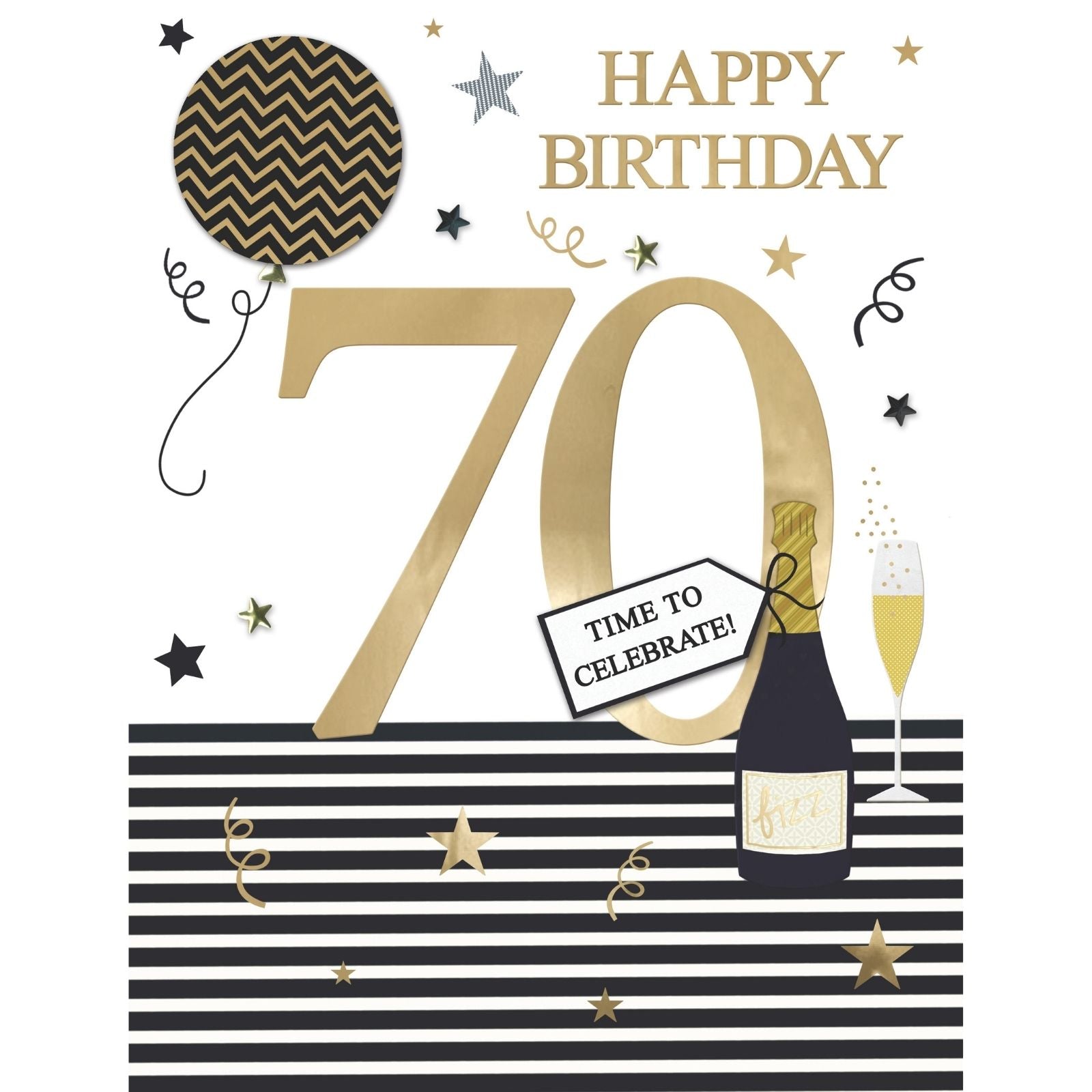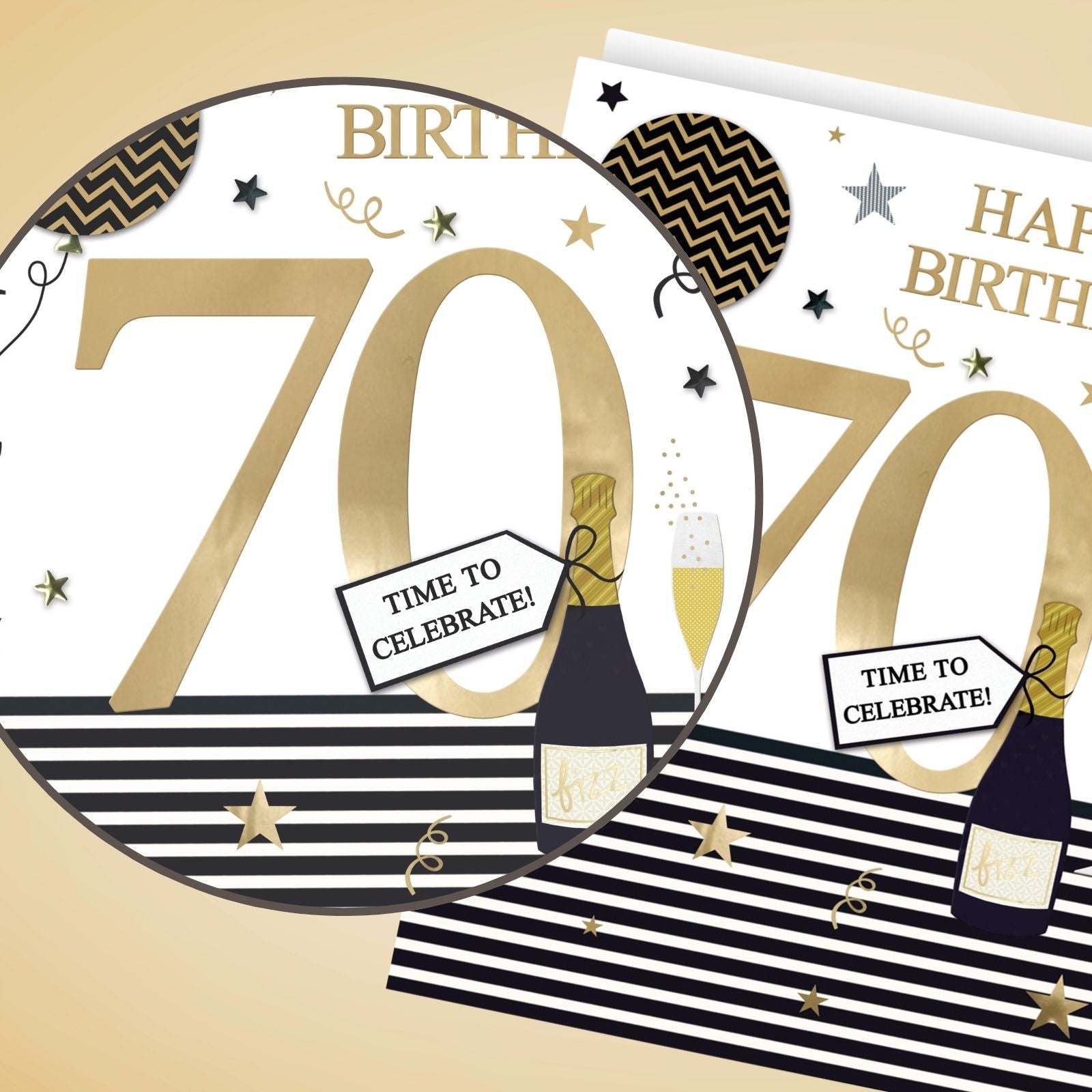 Details: This elegant handmade A4 milestone card features a gold-foiled '70' and 'happy birthday' on a stylish white background. Embellished with a bottle of fizz, a glass, and a 'time to celebrate' tag, it includes gem-finished stars and a 3D balloon. Perfect for groups to sign, it embodies a contemporary champagne theme.
