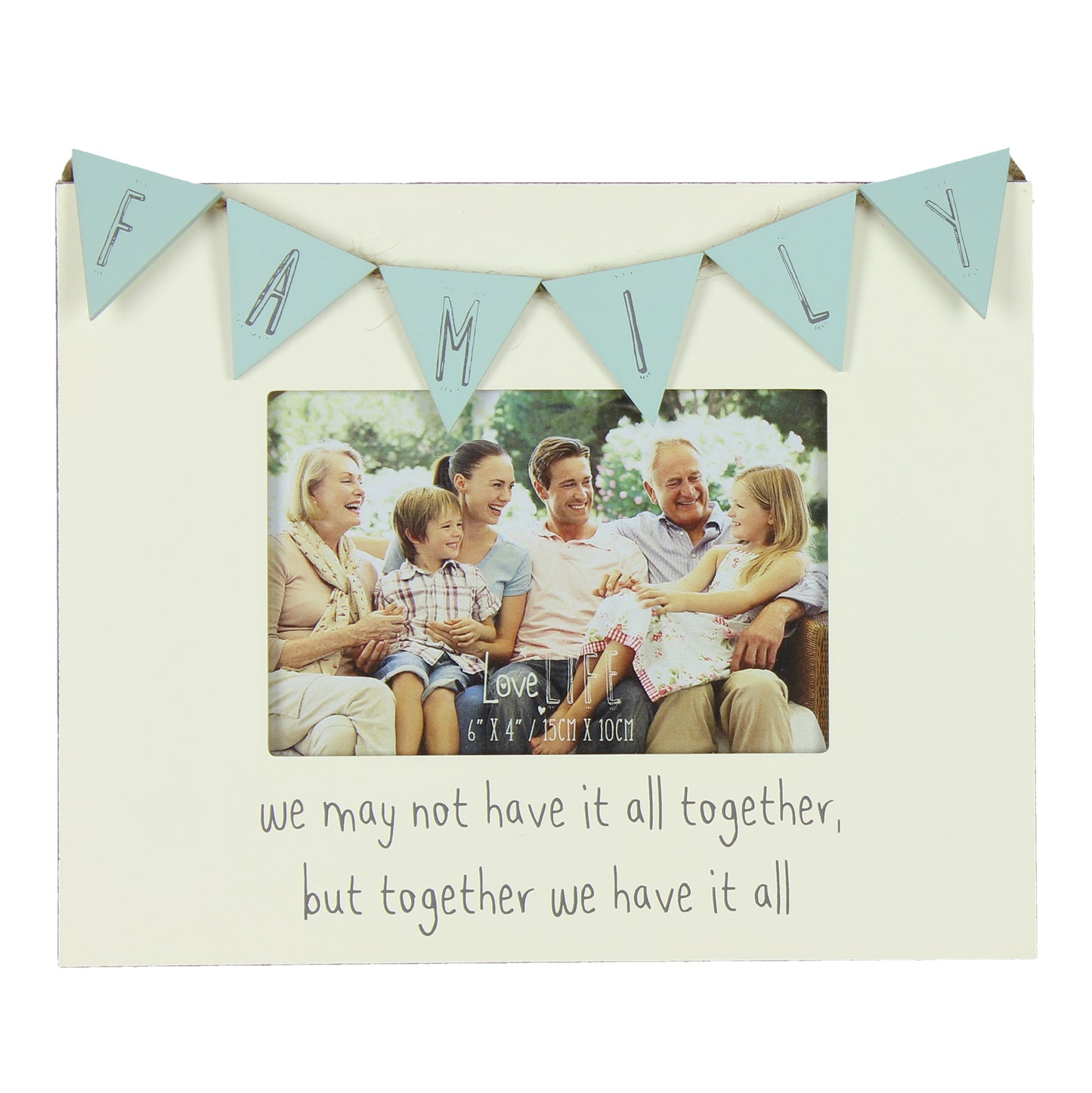 Details: A lovely wooden Love Life photo frame embellished with bunting and the caption: 'Family We may not have it all together, but together we have it all'