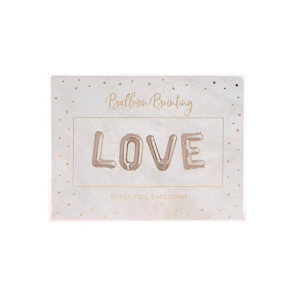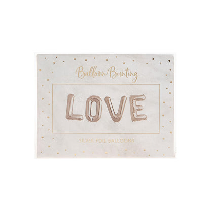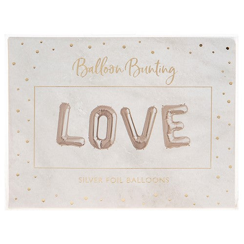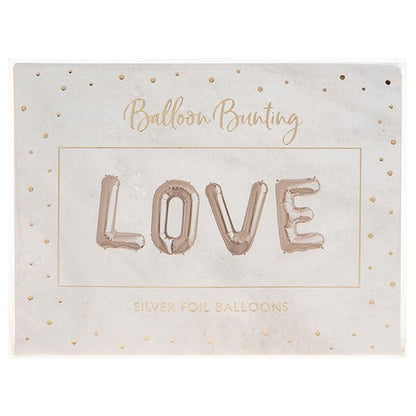 Details: A set of silver foiled bunting balloons on a string spelling out "LOVE", each letter is approx. 45cm tall