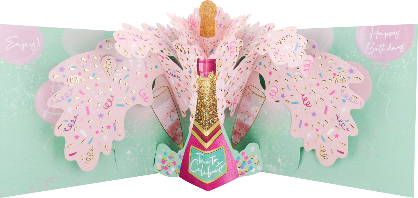 Looking for greeting card ideas for her? Receiving this feminine pop up greeting card is a delightful surprise, capturing the excitement of a special occasion. The pink champagne bottle popping symbolises celebration and joy, making it a perfect gift to show someone you care.