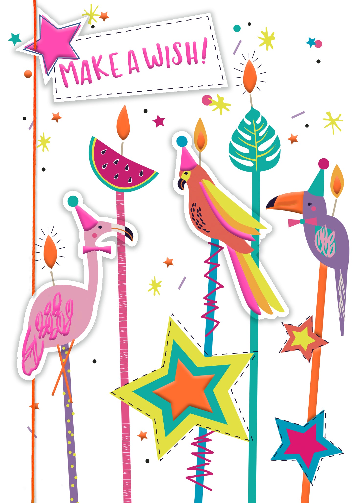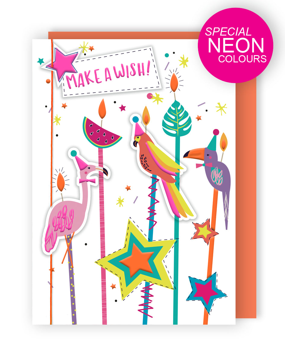 Details: This handmade and hand-finished card from Second Nature's Colour Burst range features party parrot and flamingo candles with the caption 'MAKE A WISH!' The embellished card is designed to make a special someone feel inspiring.