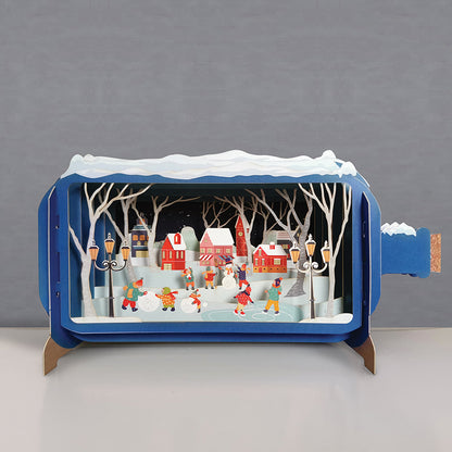 Details: An innovative laser cut festive pop up greeting card by Alljoy Design constructed with multiple layers of card in a flat design that transform to a freestanding 3D Pop up bottle shaped card featuring a festive village scene