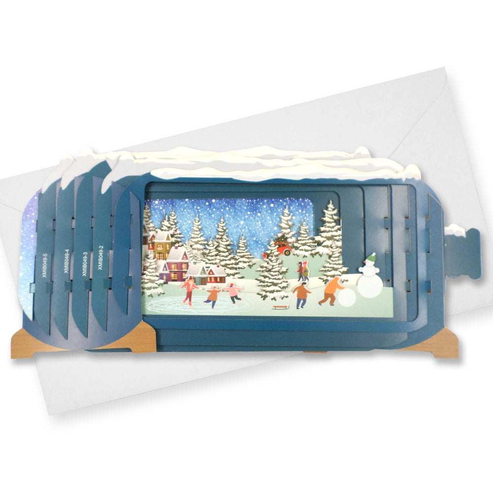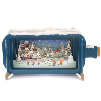 Details: An innovative laser cut festive pop up greeting card perfect for someone special at Christmas. The card is constructed with multiple layers of card in a flat design that transforms to a freestanding 3D Pop up bottle shaped card, it is designed By Alljoy Cards Design and comes complete with an envelope.