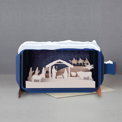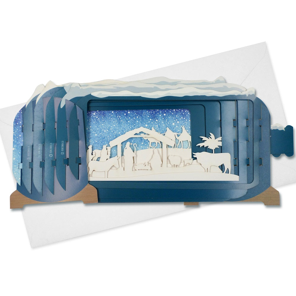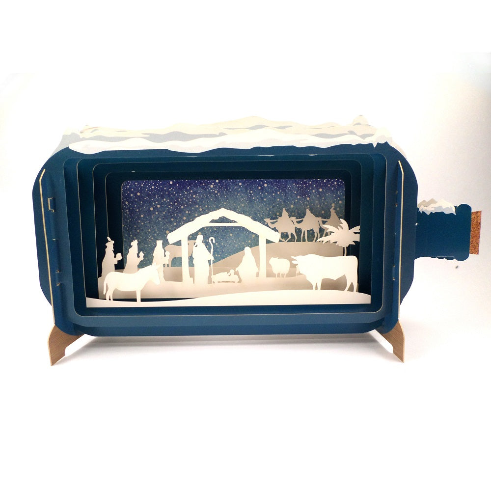 Details: An innovative laser cut festive pop up greeting card perfect for someone special at Christmas. The card is constructed with multiple layers of card in a flat design that transforms to a freestanding 3D Pop up bottle shaped card, it is designed By Alljoy Cards Design and comes complete with an envelope.