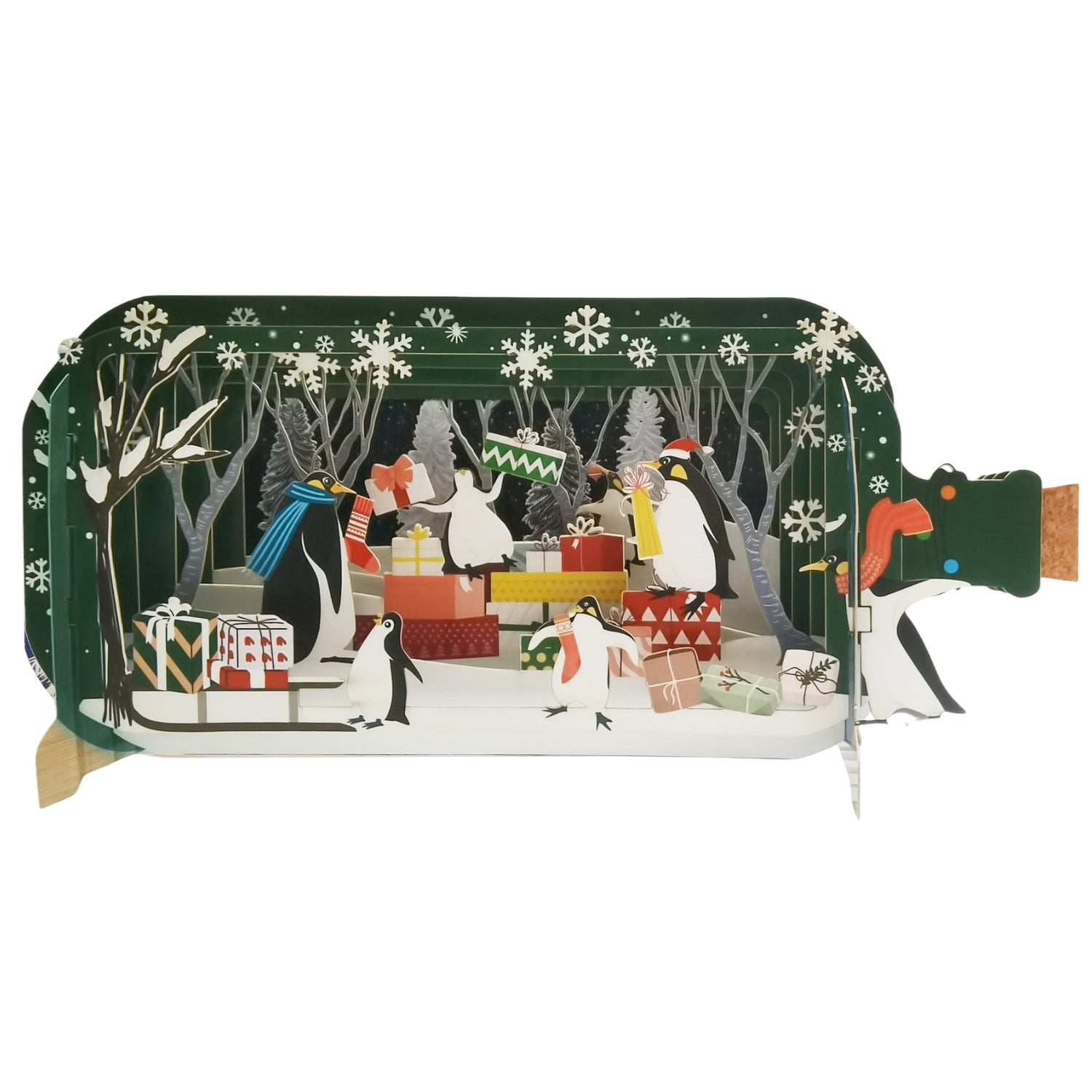 Details: This charming pop-up card from Alljoy Design's Message In A Bottle range showcases a delightful scene of penguins exchanging Christmas presents in a snowy woodland.