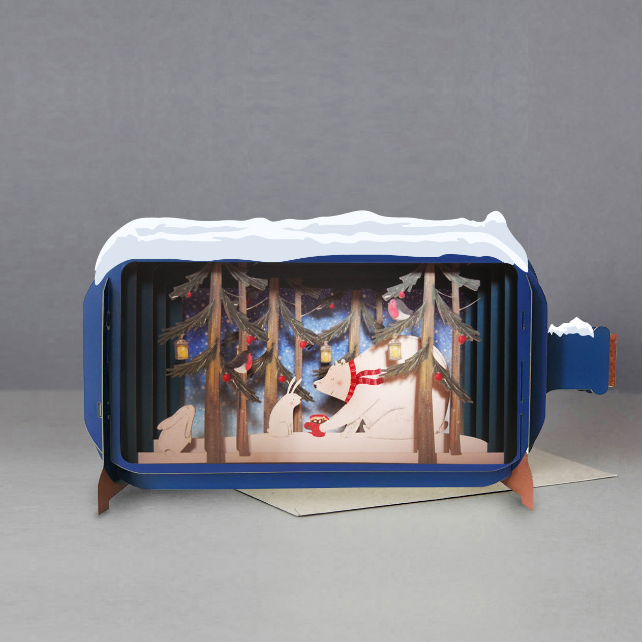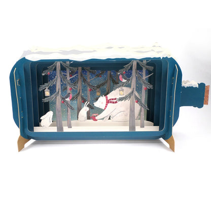 Details: An innovative laser cut festive pop up greeting card perfect for someone special at Christmas. The card is constructed with multiple layers of card in a flat design that transforms to a freestanding 3D Pop up bottle shaped card, it is designed By Alljoy Cards Design and comes complete with an envelope.