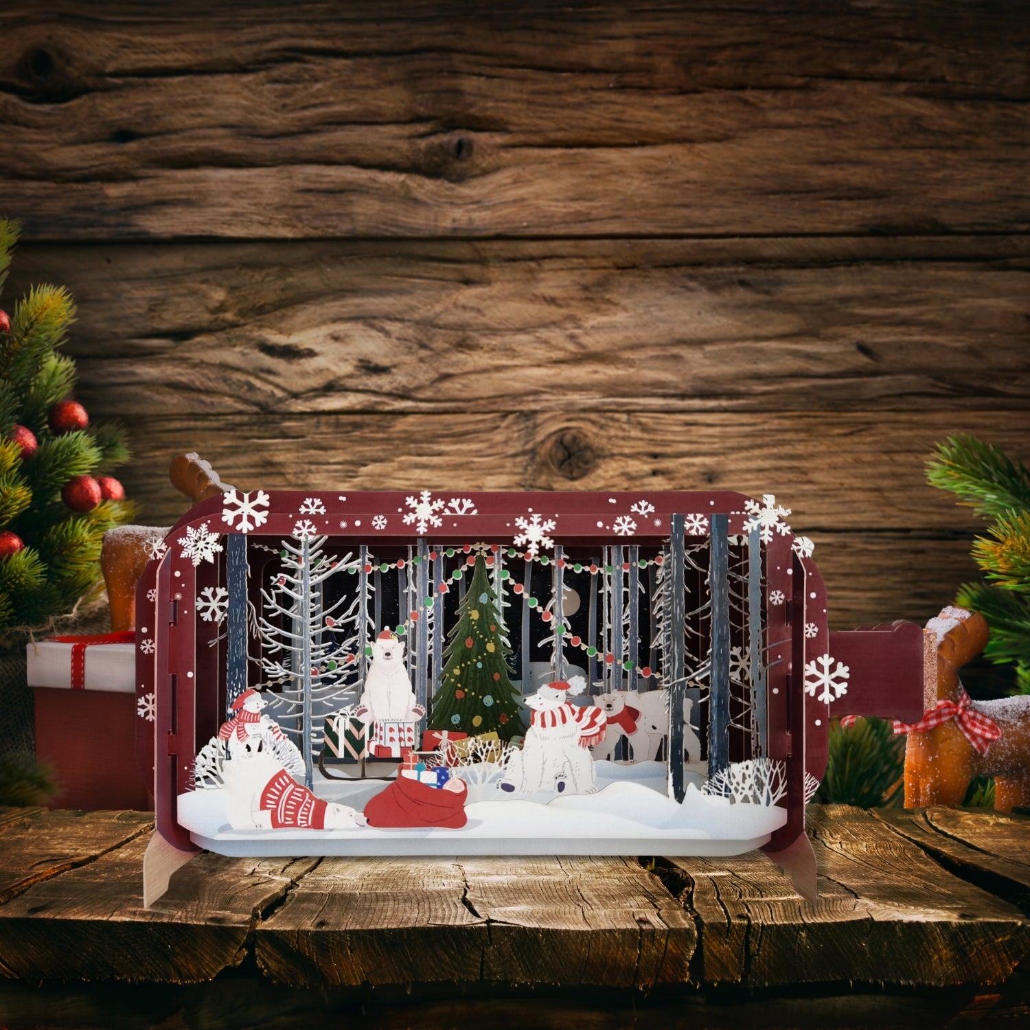 Looking for unique Christmas card ideas? This magical pop up card captures the essence of Christmas with its winter wonderland scene, complete with partying polar bears, twinkling tree, and piles of gifts. It's the perfect way to express your love and surprise someone special on this festive occasion.