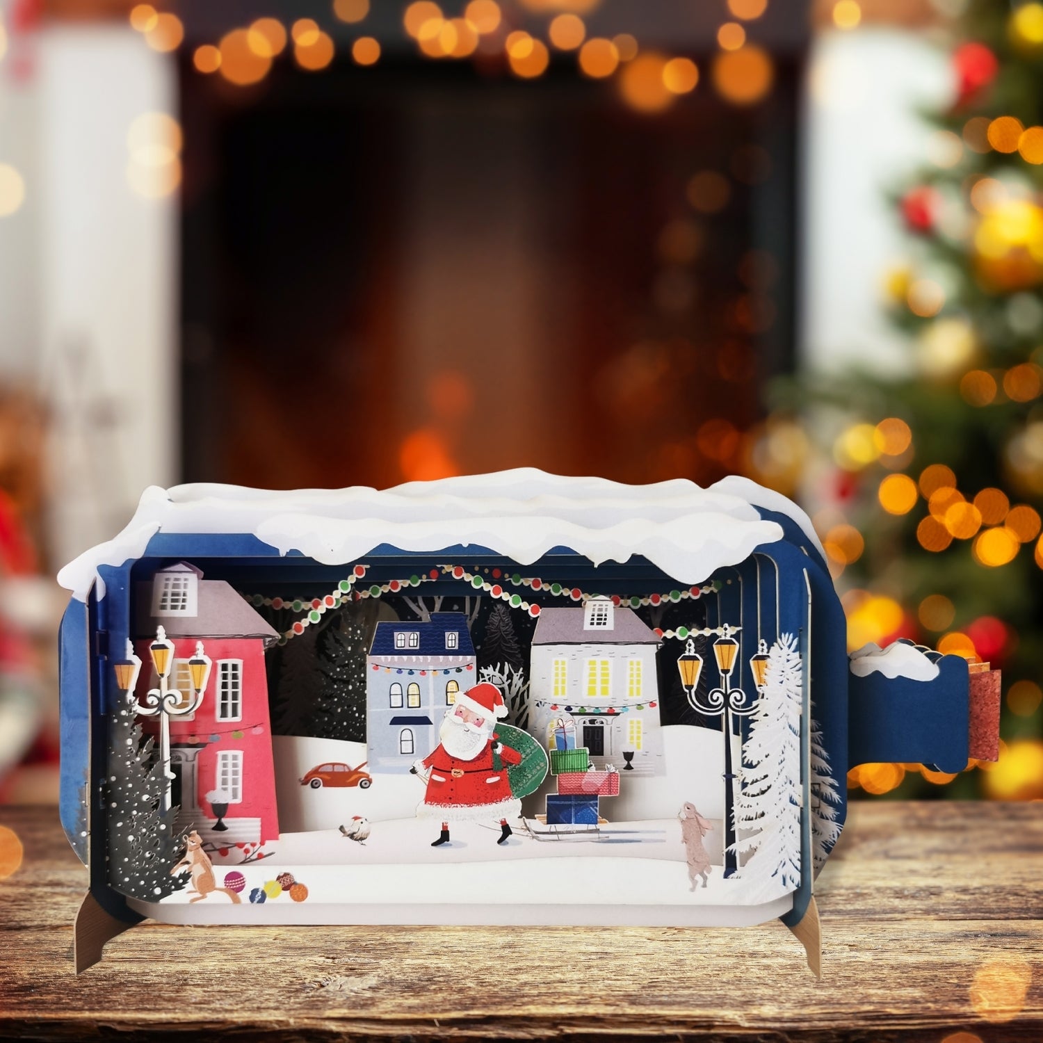 Details: This pop up card from Alljoy Design is a part of their Message In A Bottle range. With a festive snowy village at night, vibrant Christmas lights, and colourful garlands, it depicts a 3D scene of Santa delivering presents.