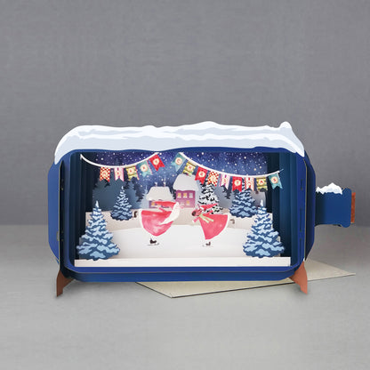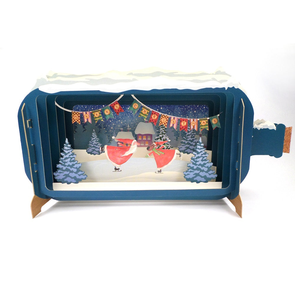 Details: An innovative laser cut festive pop up greeting card perfect for someone special at Christmas. The card is constructed with multiple layers of card in a flat design that transforms to a freestanding 3D Pop up bottle shaped card, it is designed By Alljoy Cards Design and comes complete with an envelope.
