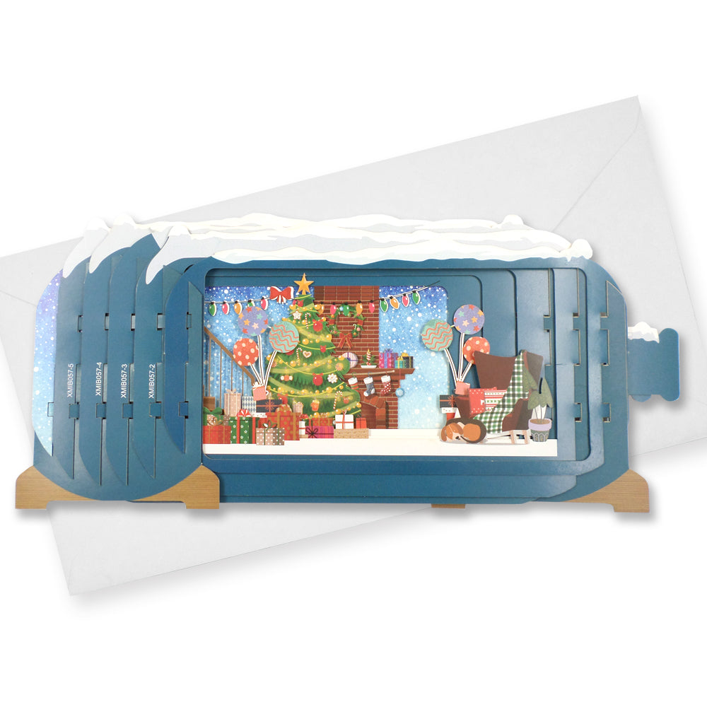 Details: An innovative laser cut festive pop up greeting card perfect for someone special at Christmas. The card is constructed with multiple layers of card in a flat design that transforms to a freestanding 3D Pop up bottle shaped card, it is designed By Alljoy Cards Design and comes complete with an envelope.