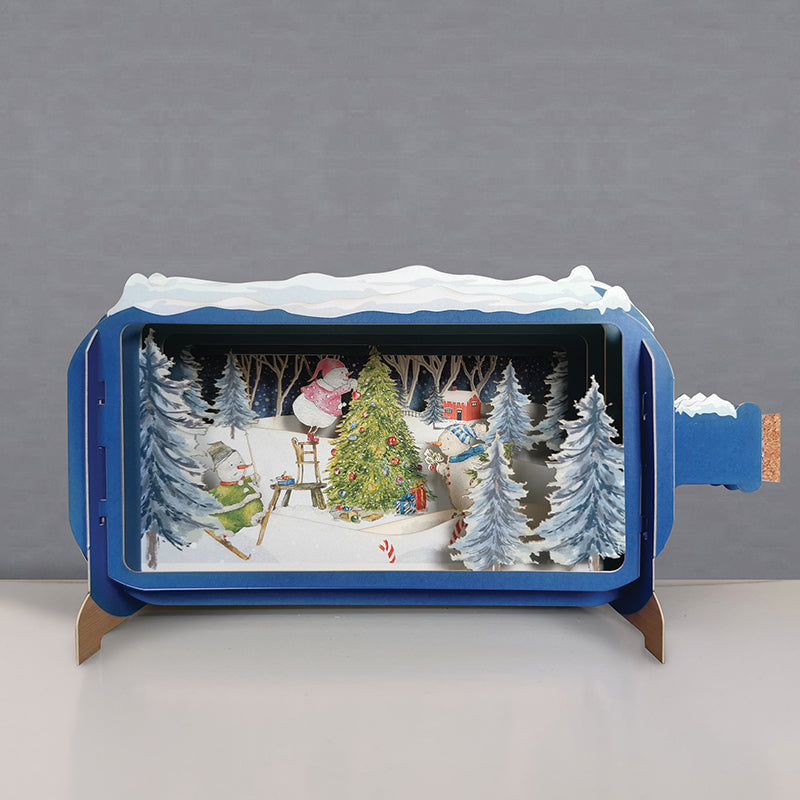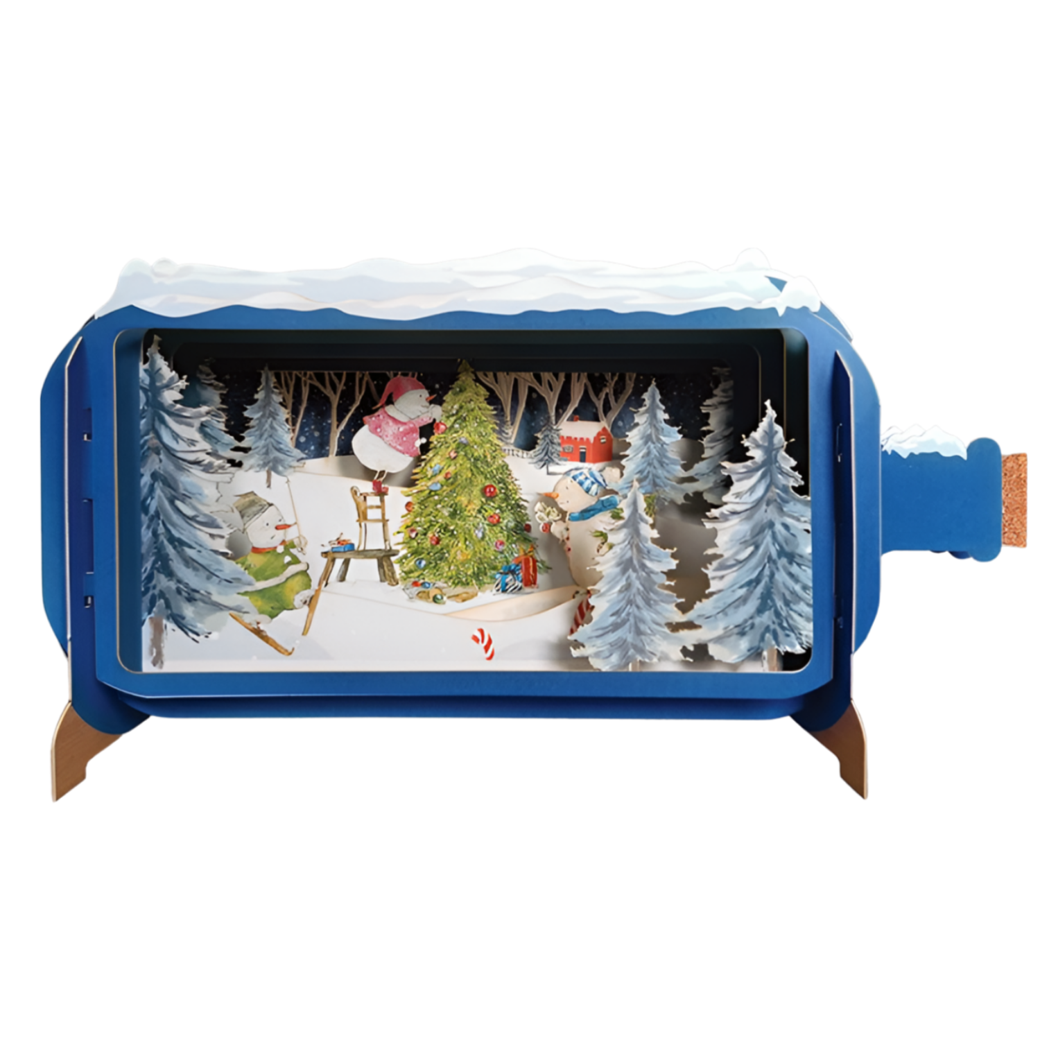Details: An innovative laser cut festive pop up greeting card by Alljoy Design constructed with multiple layers of card in a flat design that transform to a freestanding 3D Pop up bottle shaped card featuring snowmen decorating a tree