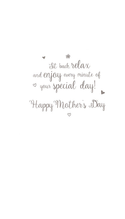 Looking for the perfect way to show your love and appreciation for your mum? This beautifully embellished card with a heartfelt message encourages her to relax and enjoy Mother's Day, making it a truly memorable gesture that reflects just how much you care.